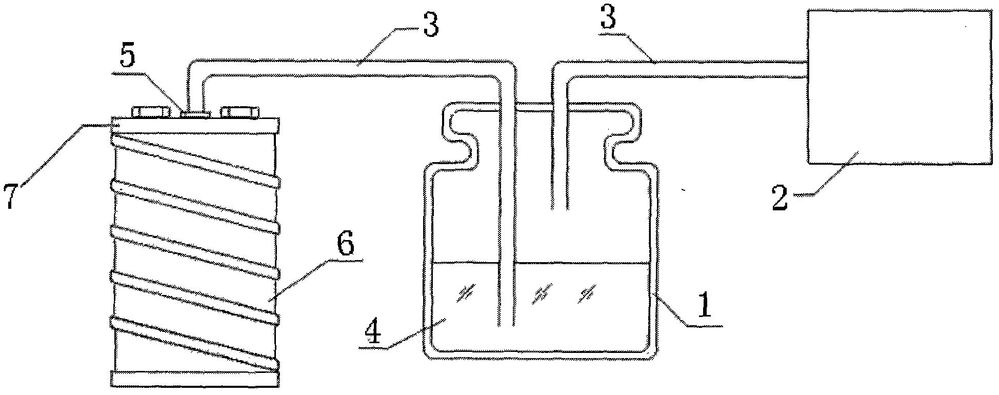 本实用新型涉及一种锂电池塑料壳测漏装置,包括:磨口瓶、负压装置、密封接头和气管,所述磨口瓶为密封的玻璃透明容器,所述磨口瓶内装有清水,一根气管一端通过密封接头与动力锂电池的电池塑料壳连接,另一端伸入磨口瓶的清水内;另一根气管一端插入磨口瓶内但与清水不接触,另一端与负压装置连接。由于气管将电池塑料壳、磨口瓶、负压装置连接在一起构成一个密闭的测量腔体,可以在动力锂电池大批量生产环节中方便地检测焊接好的锂电池塑料壳是否存在漏气情况,大大提高成品率。