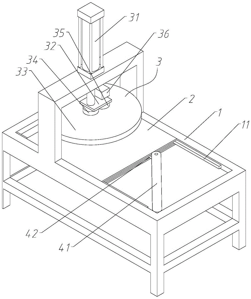 本实用新型属于皮革处理技术领域,提出了一种皮革生产用的自动压花机,包括机架,工作台,设置在机架上,工作台的工作面水平;压花模组,设置在机架上,位于工作台的上方,包括:第一动力机构,设置在机架上,支架,与第一动力机构连接,在第一动力机构的作用下,沿竖直方向运动,模具安装架,转动设置在支架上,绕竖直轴线转动。通过上述技术方案,解决了现有技术中皮革压花机在压制不同角度的压花时使用不方便的问题。