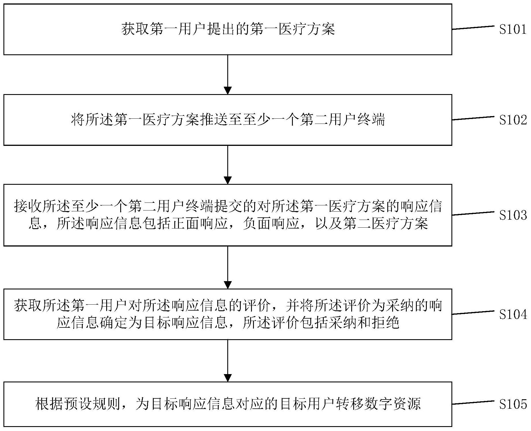本申请公开了一种信息管理方法及装置。该方法包括:获取第一用户提出的第一医疗方案;将所述第一医疗方案推送至至少一个第二用户终端;接收所述至少一个第二用户终端提交的对所述第一医疗方案的响应信息,所述响应信息包括正面响应,负面响应,以及第二医疗方案;获取所述第一用户对所述响应信息的评价,并将所述评价为采纳的响应信息确定为目标响应信息,所述评价包括采纳和拒绝;根据预设规则,为目标响应信息对应的目标用户转移数字资源。此外,还公开了与该方法对应的装置。实施本申请的方案,能够拓展用户的求医渠道,为用户提供更多可靠的医疗方案,保障用户的诊疗效果。