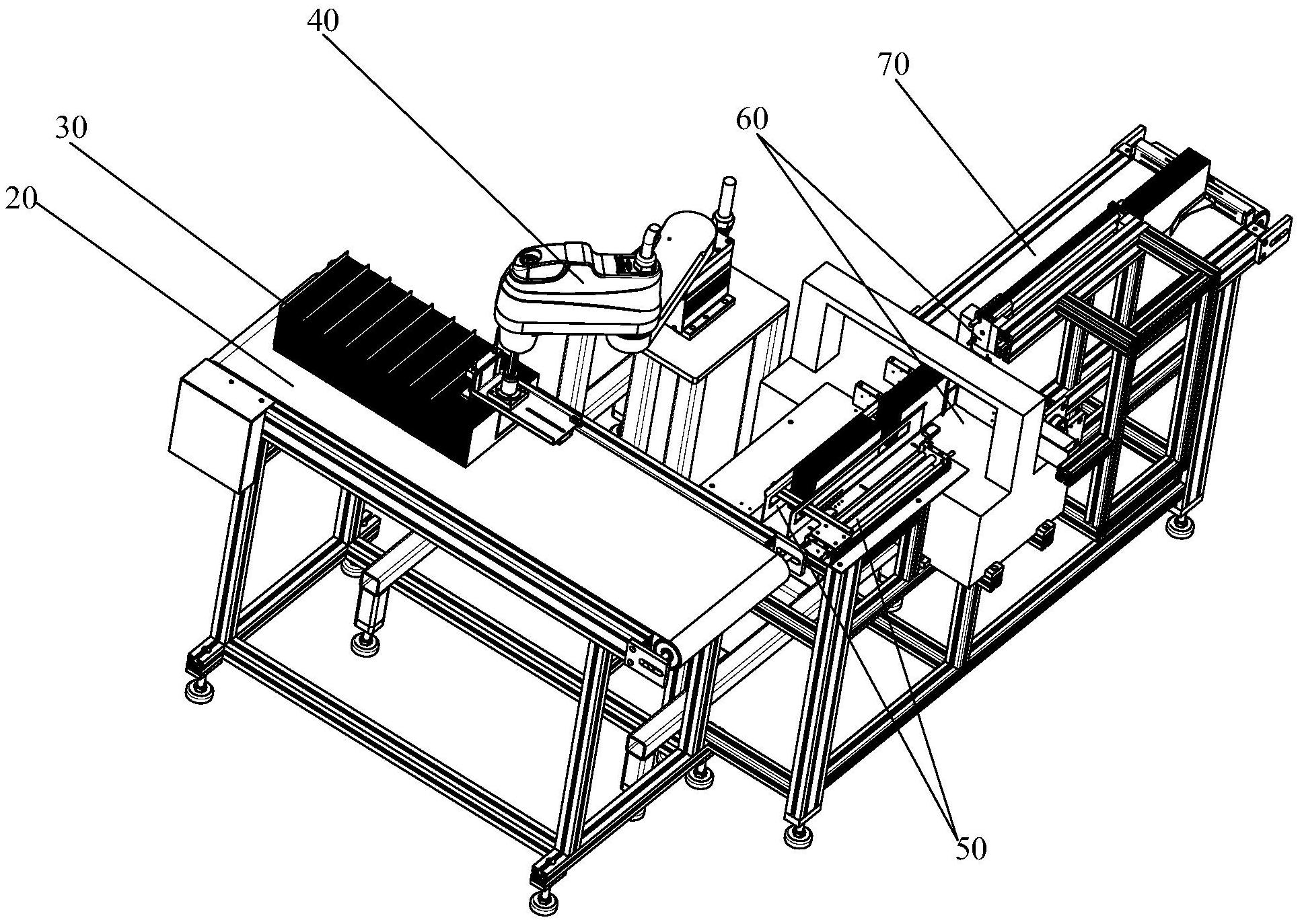 本实用新型公开一种用于糊盒机收料的智能抓取打包设备,包括送料机构、用于抓取送料机构上的物料的抓取机构、放料机构、打包机构、产品输出机构;所述抓取机构用于将送料机构上的产品抓取后放置在放料机构上,所述放料机构用于将产品推送至打包机构进行打包,所述产品输出机构用于将打包完成后的产品进行装箱。本实用新型打包设备结构简单、维护方便、生产成本低、利用价值高;该设备具有高效、稳定、安全、节约占地空间;能替代传统人工手动抓取打包的工作,同时能消除夹具在抓取时纸盒连同带起等问题;改设备具备了快、稳、准的原则,从而满足现有客户的需求。