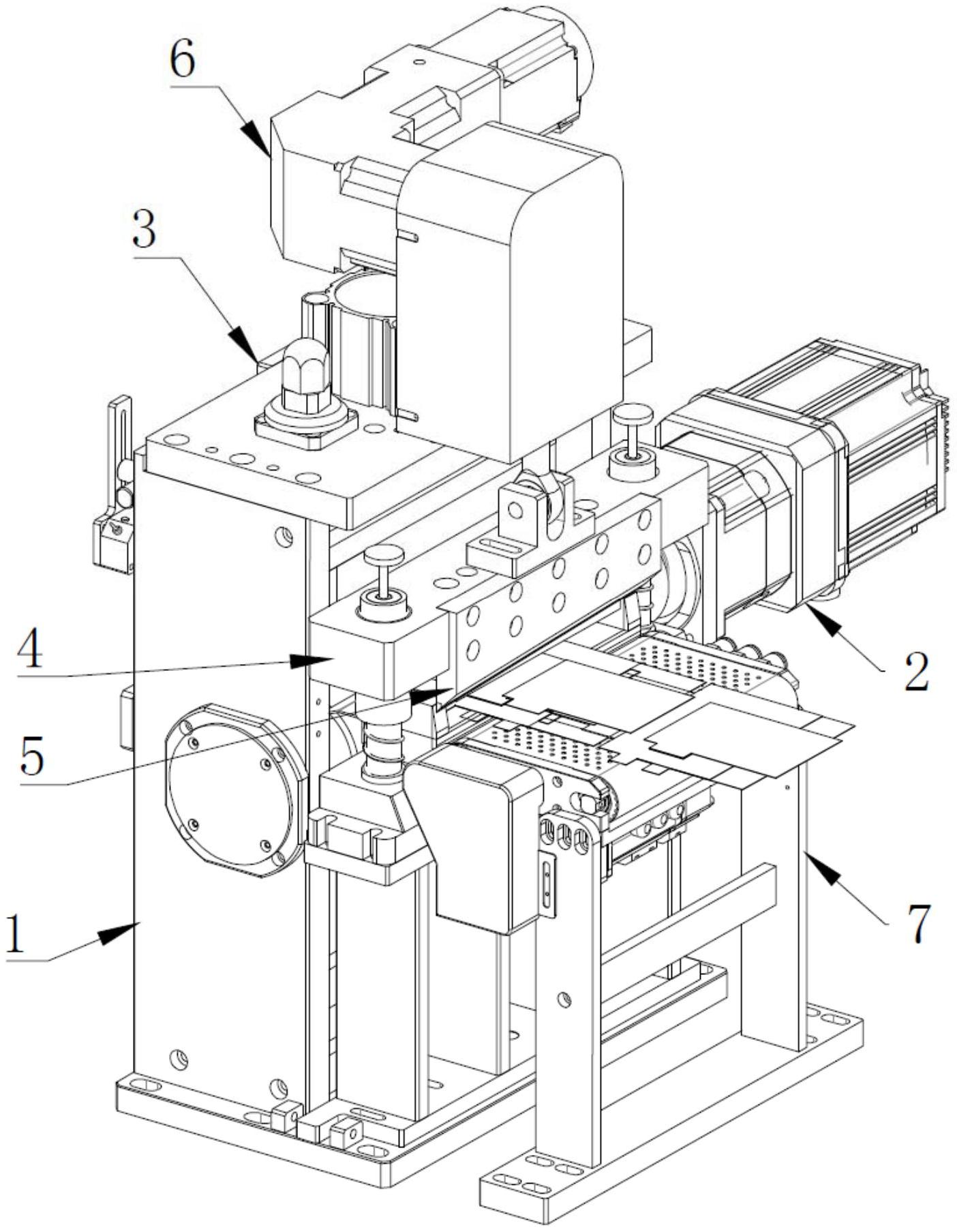 本实用新型涉及极片切断技术领域,具体涉及一种基于陶瓷刀架的极片裁切装置,包括导料支撑架、安装于导料支撑架的导料组件、安装于导料支撑架并能位于导料组件上方的压紧组件、设于导料支撑架一侧的陶瓷刀架、安装于陶瓷刀架的切刀、及安装于导料支撑架并用于驱动陶瓷刀架并带动切刀活动的切料驱动组件;本实用新型由于采用陶瓷刀架来配合切刀将极片切断,切断稳定性好,尤其针对大尺寸极片切断,切刀锁紧在陶瓷刀架上,防变形效果好,结构稳定可靠。