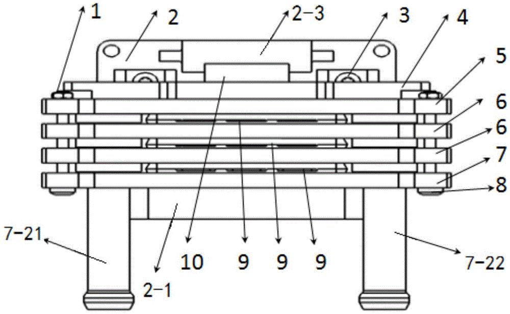 本实用新型涉及一种双面冷却散热器结构组件,包括冷板组件,所述冷板组件上设有进水管和出水管,所述冷板组件包括层叠排列的多个冷板体,每个冷板体中设有散热水道且都并联连接在进水管和出水管之间,所述水道中设有散热翅片;还包括固定支架,所述固定支架上设有相对设置的固定挡板和调节挡板,所述冷板组件固定在所述固定挡板和调节挡板之间,所述冷板组件与调节挡板之间设有用于调节压紧程度的楔形滑块。与现有技术相比,本实用新型采用双面冷却散热器层叠式的散热结构,散热能力强,且扩展方便,具有简单可靠、小型紧凑、重量轻、安装方便、易于实现单电机、多电机同步工作等优点。