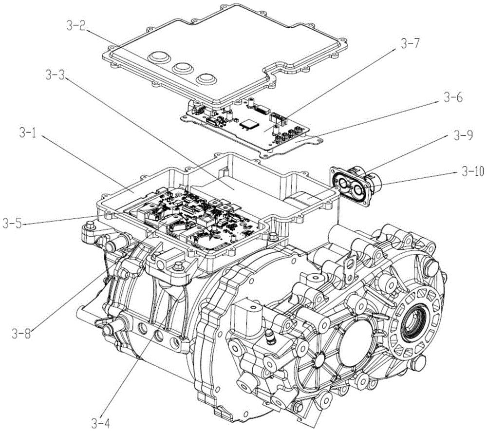 本实用新型涉及一种集成式三合一电机控制系统,包括变速箱、驱动电机和电机控制器,电机控制器包括箱体和设置于箱体内部的薄膜电容、功率模块、驱动板、屏蔽板、控制板、三相输出极板、磁环组件,变速箱固定在驱动电机的前端,电机控制器固定在驱动电机的顶部;薄膜电容、功率模块、屏蔽板、磁环组件均固定在箱体的底板上,三相输出极板和驱动板均固定于功率模块上,控制板固定在屏蔽板上,功率模块的输入端与薄膜电容的输出端电气连接,三相输出极板的一端与功率模块电气连接,另一端与驱动电机电气连接。与现有技术相比,本实用新型具有空间利用率高、体积小、高度低以及散热性能好等优点,且适合批量生产。