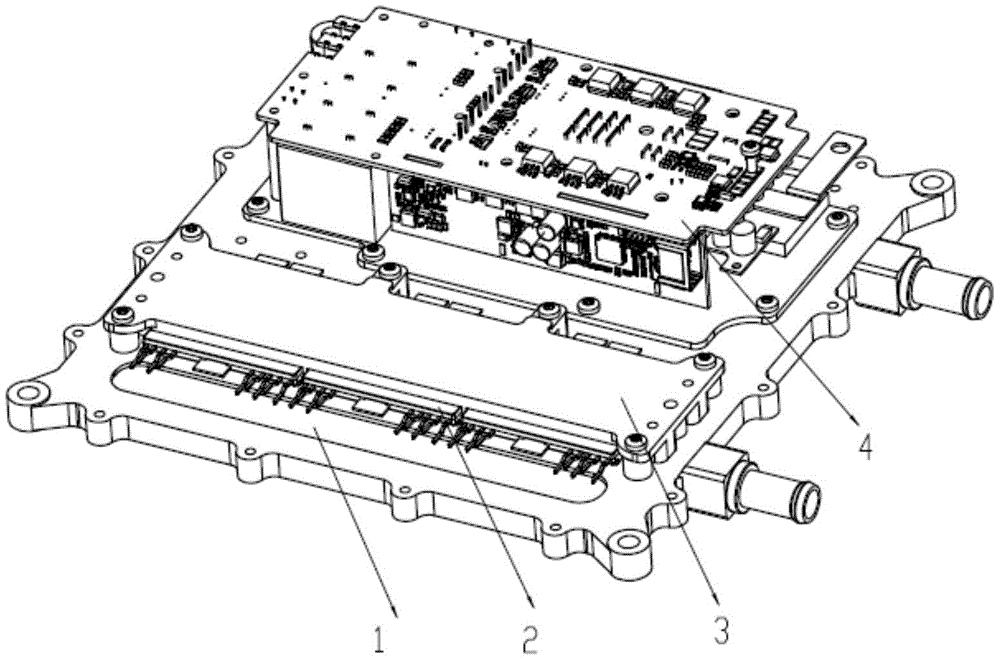 本实用新型涉及一种用于电动汽车的集成高功率控制器,包括功率模块、DC/DC集成模块和底板,所述功率模块和DC/DC集成模块分别设置在所述底板的上表面,所述底板的底部设有覆盖功率模块底部和DC/DC集成模块底部的散热结构,所述散热结构包括带有折弯的散热水道以及与散热水道连通的进水口和出水口。与现有技术相比,本实用新型将功率模块和DC/DC集成模块都集成在电机控制器的底板上方,并共用底部的散热水道,具有占用空间小、散热能力强的优点,整体结构可靠,装配方便,适合批量生产;DC/DC集成模块设置在底板的上方,避免在整车运行过程中造成振动损坏。