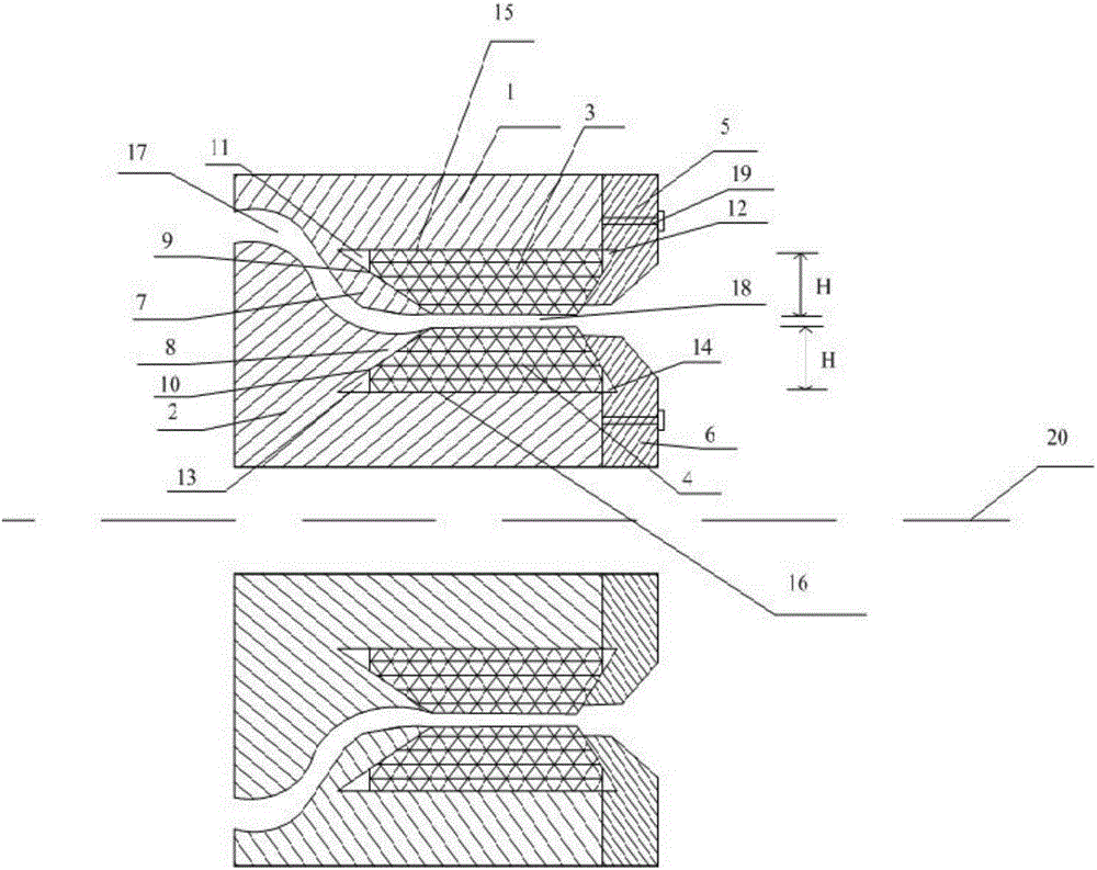 本发明公开了塑料挤出模具的口模和芯模结构,包括口模(1)和芯模(2),所述口模(1)为中空的圆柱状,所述芯模(2)与所述口模(1)同轴设置并置于所述口模(1)内,所述口模(1)内表面与所述芯模(2)外表面形成流体流动的第一环形通路(17),并且,在所述口模的出口端上沿与口模轴线平行的方向安装有口模嵌件(3),所述芯模的出口端上沿与口模轴线平行的方向安装芯模嵌件(4),所述口模嵌件(3)和所述芯模嵌件(4)之间形成流体流动的第二环形通路(18);其中,口模嵌件(3)和芯模嵌件(4)都采用聚四氟乙烯材料制成。使用该塑料挤出模具的口模和芯模结构,可以极大地提高塑料管材的内外壁表面的光洁度和平整度。