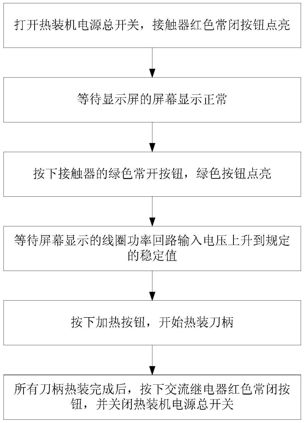 本发明提出一种热装机功率回路启动与过载保护方法,属于电路系统保护领域。本发明技术方案要点为:打开热装机电源总开关,接触器红色常闭按钮点亮;等待显示屏的屏幕显示正常;按下接触器的绿色常开按钮,绿色按钮点亮;等待屏幕显示的线圈功率回路输入电压上升到规定的稳定值;按下加热按钮,开始热装刀柄;所有刀柄热装完成后,按下交流继电器红色常闭按钮,并关闭热装机电源总开关。本发明能够有效解决热装机刀柄加热过程中电压不稳定导致无法加热的问题。