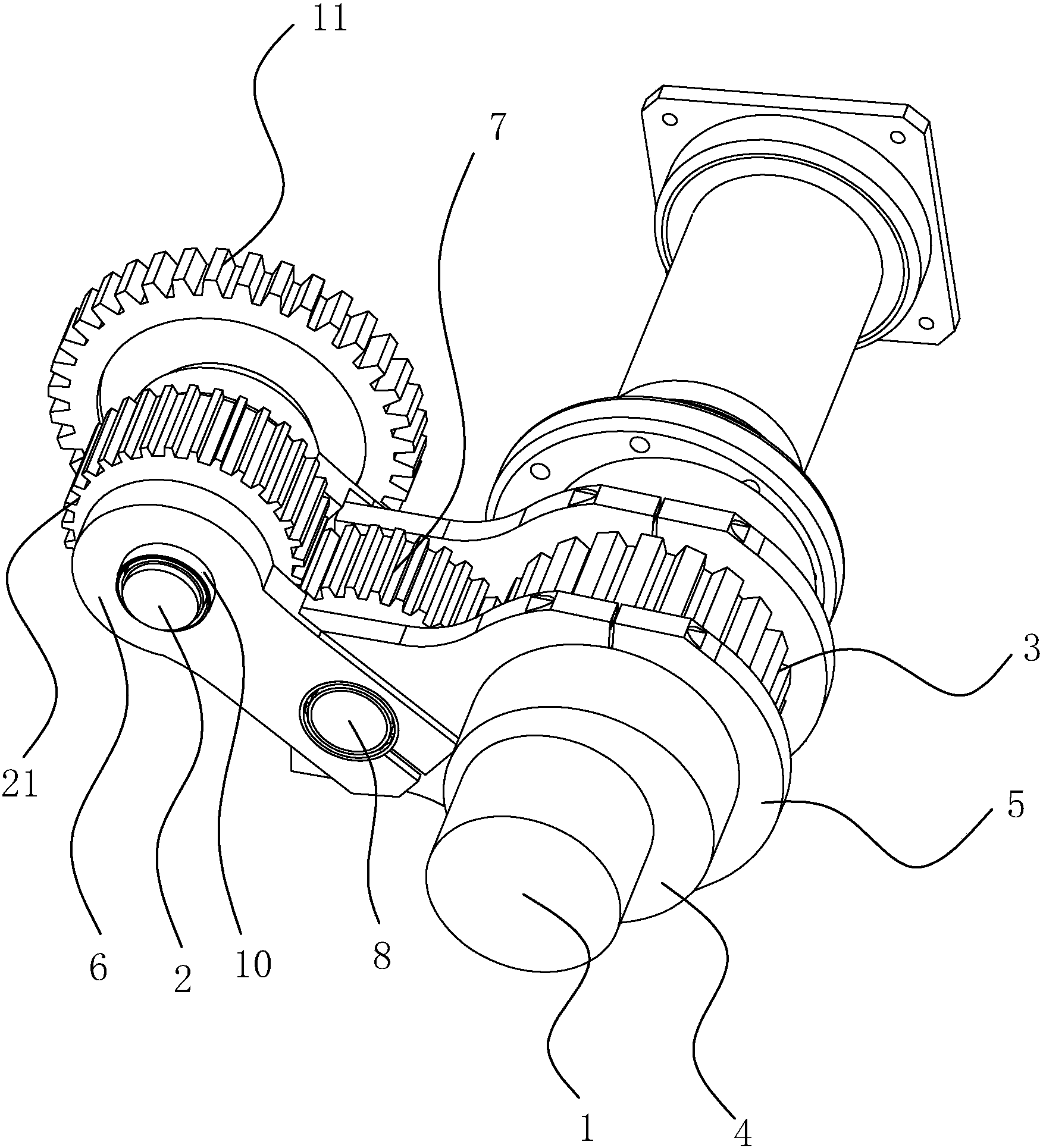 本实用新型公开了一种模切机变速输送机构,包括连接于模切机主轴的主动辊、连接于送纸机构的输出辊,所述主动辊偏心设置有偏心齿轮,所述输出辊同轴设置有输出齿轮,所述偏心齿轮同轴设置有偏心柱,所述偏心柱套设有第一连接板,所述输出辊套设有第二连接板,所述第一连接板与所述第二连接板铰接,所述第一连接板和第二连接板的铰接处转动连接有与所述偏心齿轮以及输出齿轮啮合的传动齿轮。本方案采用新的机械结构。本实用新型具有以下优点和效果:主动辊转动时,偏心齿轮发生偏心转动,带动传动齿轮转动,输出辊发生变速转动,能够输出动力,实现送纸机构变速输送的作用。
