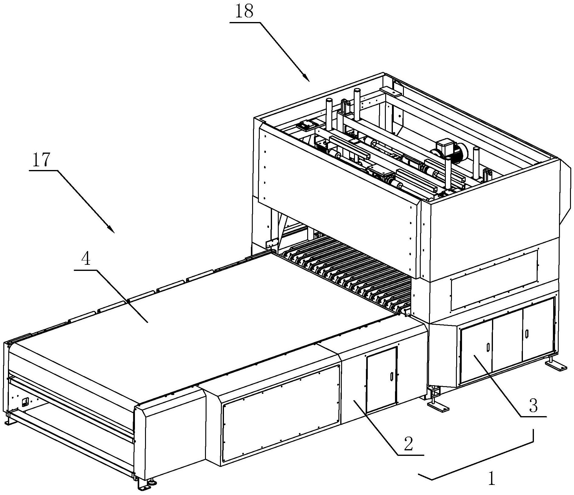 本实用新型公开了一种分剁机,涉及纸盒加工技术领域,包括工作台,工作台分设为第一平台以及第二平台,第一平台、第二平台上分别设有送料区以及分剁区,分剁区用于将纸盒按照压痕线分离成第一盒体和第二盒体,送料区包括送料带以及驱动机构,驱动机构与送料带驱动连接,分剁区包括转运输送机构、出料输送机构以及压紧分剁机构,且转运输送机构、出料输送机构之间形成间隙,当纸盒处于转运输送机构、出料输送机构上且压痕线处于间隙中时,两个压紧分剁机构分别靠近转运输送机构、出料输送机构且与纸盒抵紧设置,且出料输送机构翻转带动第二盒体远离第一盒体,纸盒的压痕线受力被拉扯至撕裂,减少操作人员的劳动量以及减少人工成本。