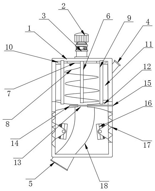 本实用新型涉及一种PE管原料混合搅拌装置,属于PE管原料混合搅拌技术领域,解决现有技术中壳体内壁无法清理以及搅拌装置运行时间短的问题。采用以下技术方案:包括壳体、电机、进料口、出料口,所述电机位于壳体上部,所述进料口位于壳体一侧上部,所述出料口位于壳体底部,所述壳体分为上层和下层,上层与下层之间设有隔离装置,上层内设有搅拌装置,所述搅拌装置与电机连接,搅拌装置一侧设有清理机构,下层内设有加热装置。该装置将搅拌和加热分为两步,使得搅拌设备运行时间延长,刮板能够有效刮出内壁上的原料,有助于节省资源,移动挡板使其进入加热装置中,加热效果更好,且在加热的同时,搅拌装置可再加入原料进行搅拌,节省时间。