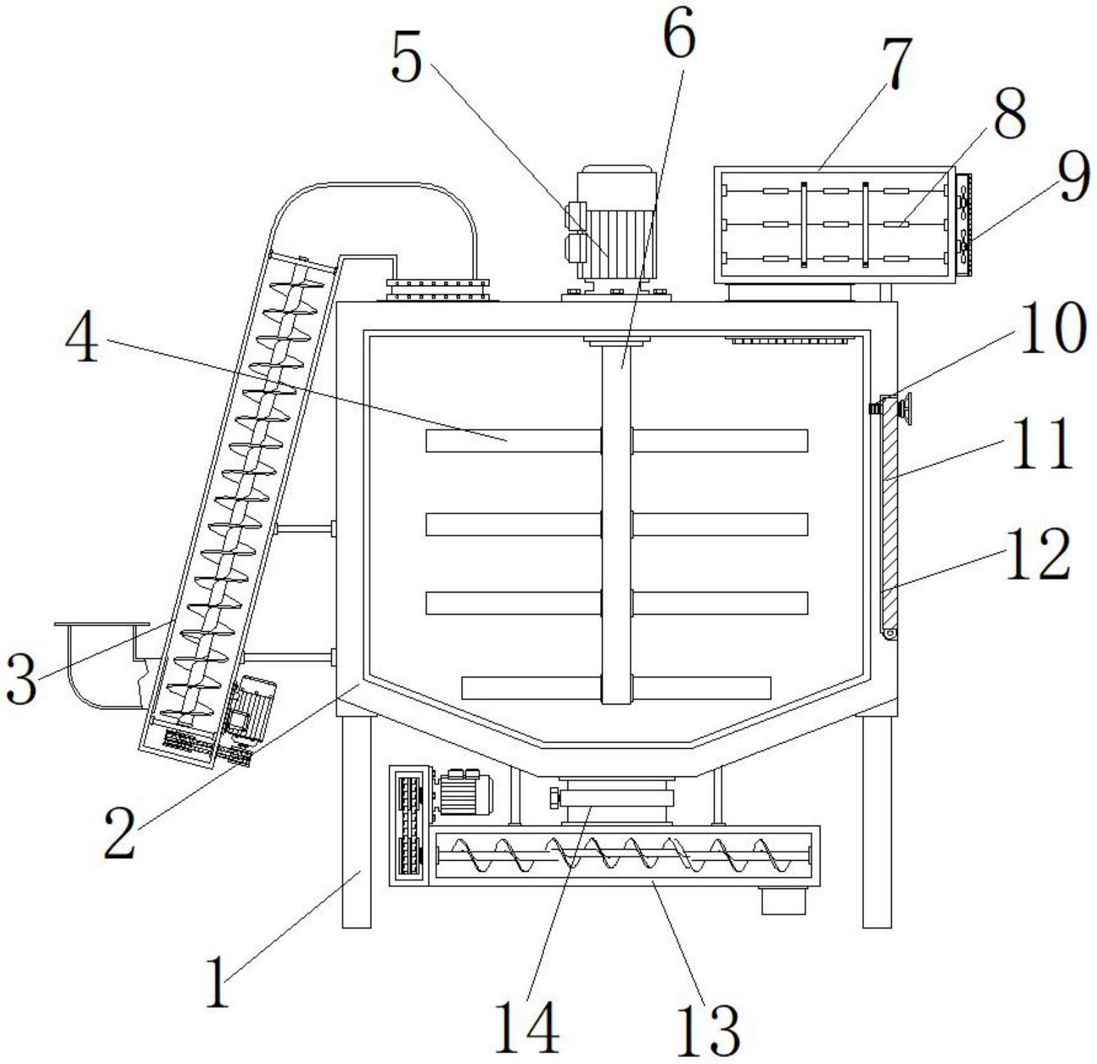 本实用新型公开了一种便于上料式高速混料烘干机,包括混料箱,所述混料箱底端的四个拐角处分别竖向固定有支腿,所述混料箱的左侧固定有上料筒,所述混料箱顶端的中间位置处固定有第一驱动电机,所述混料箱内部的顶端竖向活动连接有转轴。该便于上料式高速混料烘干机通过混料烘干机在使用的过程中,可以在混料箱的右侧,分别将翻板右侧顶部两端的拆装杆从螺纹孔的内部旋出后,即可将翻板从内槽内部进行解锁,将翻板利用与内槽内部底端之间的铰接,从内槽的内部向下翻开,打开混料箱的内部后,方便对混料箱内部的组件进行维护检修,以及对混料箱的内部进行清理清洁,解决了不便于对混料机的内部进行维护清洁的问题。