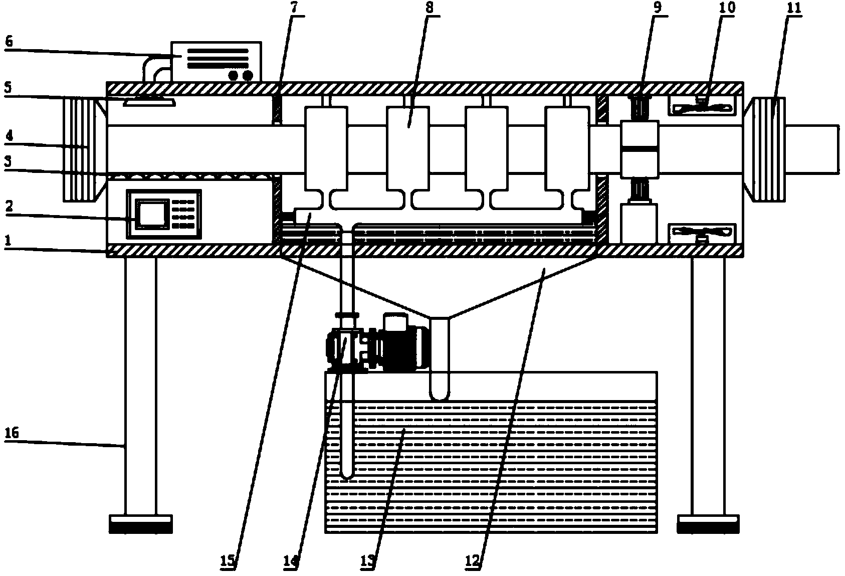 本实用新型公开了一种塑料管材快速冷却装置,包括装置本体,所述装置本体内部安装有两块隔板,且隔板表面开设有通孔,两块所述隔板之间安装有浇注套管。本实用新型中,在装置本体内部安装有浇注套管,浇注套管内部等距离安装有多个高压喷头,同时在浇注套管的的一端通过水管与水箱连接,在需要对装置本体内部的塑料管道冷却时,通过控制器启动离心泵,之后在离心泵的作用下把水箱中的液体抽入到浇注套管内部,之后再次通过高压喷头对管道浇注冷却,通过把高压喷头安装在浇注套管内部,从而使高压喷头可以对管道表面任何部位进行浇注冷却,从而改变传统只对管道上表面冷却的方式,大大提高塑料管道的冷却效率。