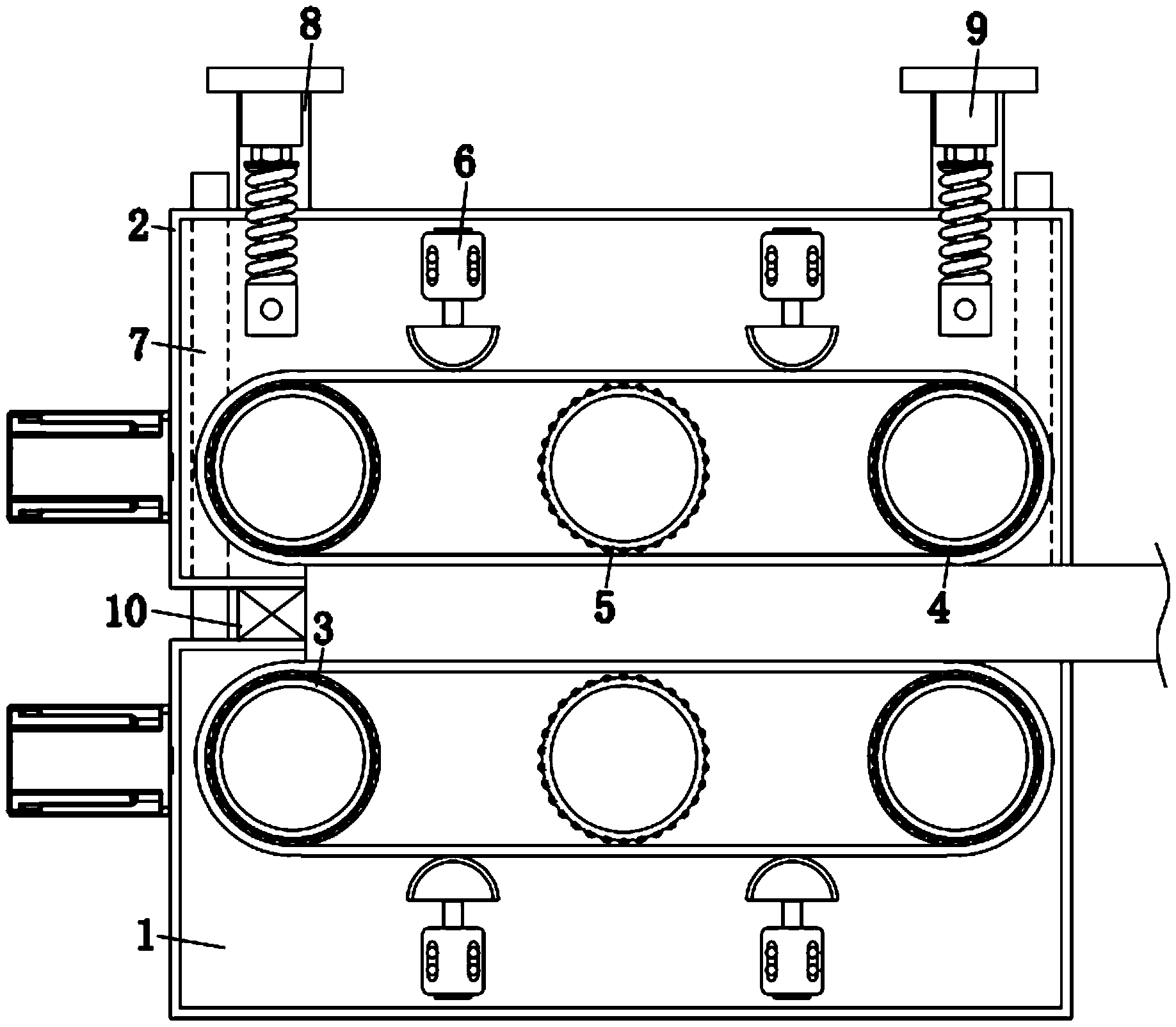本实用新型公开了一种塑料管材牵引装置,涉及工业加工技术领域。包括第一牵引部和第二牵引部,第一牵引部的顶部固定连接有和第二牵引部套接的立柱,第一牵引部和第二牵引部的前部由左至右均依次通过活动轴活动连接有通过传动带传动连接的主动牵引轮、辅助轮和被动牵引轮,第一牵引部和第二牵引部的前部固定连接有位于传动带上下表面的张紧机构,张紧机构包括张紧块、升降轴和张紧压头,第一牵引部的顶部固定连接有位于第二牵引部背部的固定背板。通过设置张紧机构,在传动带长久以往产生松垮之后,调节升降轴使得张紧压头将传动带压紧,使得传动带和被移动管材之间进行张紧形传动,避免打滑,提高牵引效果。