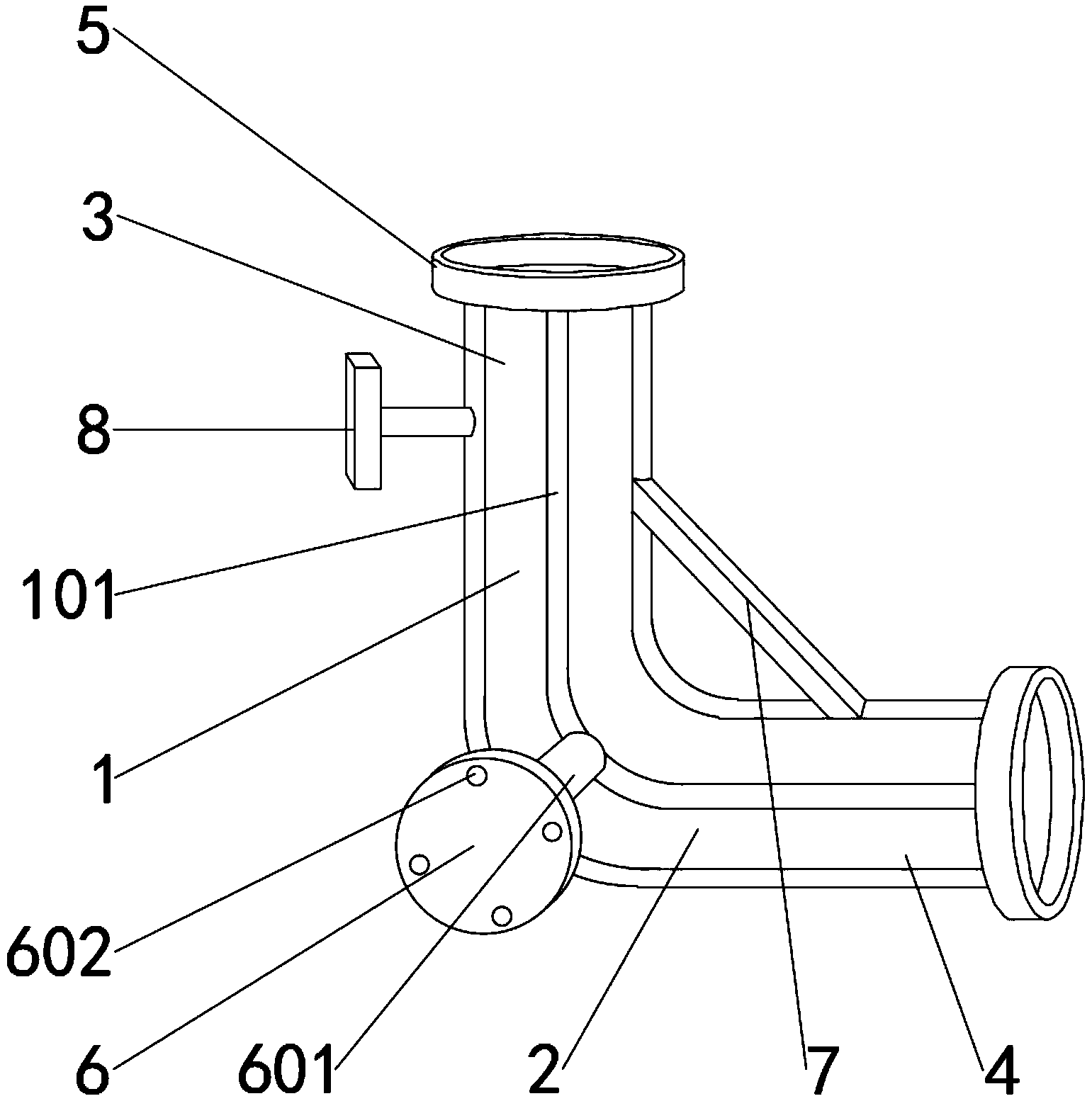 本实用新型属于管材成型模块技术领域,尤其为一种波纹管成型模头,包括竖管和横管,所述所述竖管的下端与横管的左端固定连接,所述竖管的上端安装有入水口,所述横管的右侧安装有出水口,所述固定杆的另一端固定连接有固定盘,所述竖管与横管连接处的内壁固定连接有缓冲膜,所述缓冲膜内壁的顶端固定连接有受力块,所述受力块的下端面固定连接有弹簧,所述弹簧的另一端与竖管内壁的底端固定连接,通过在横管内壁的底端设置有缓冲膜,当液体从竖管流入横管时水压变大,进而受力块向左下方移动并使弹簧压缩,然后缓冲膜凹陷,进而缓冲膜根据不同水压而改变凹陷程度,从而达到对流水的缓冲效果。