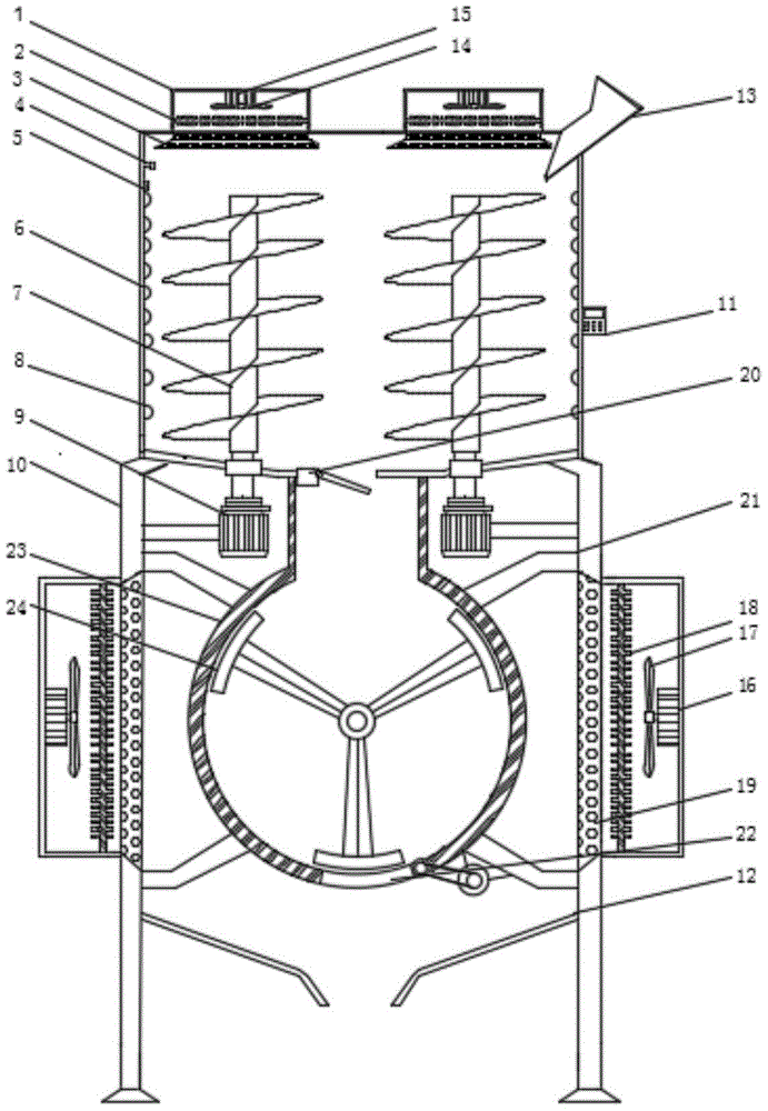 本实用新型公开了塑料颗粒烘干装置,包括第一热风机机壳和电机,所述第一热风机机壳内侧中部固定有第一热风机电机,且第一热风机电机底端中间位置设有扇叶,所述扇叶下方固定有第一翅片加热管,所述第一热风机机壳底部焊接有出风口,所述热风机机壳底部外侧与装置本体焊接,且装置本体上部一侧焊接有进料口,所述装置本体侧面设有控制器。本实用新型中,塑料颗粒烘干装置采用两组螺旋输送桨及第一热风机机壳、第一翅片加热管、第一出风口、温度感应器、湿度传感器、装置本体、螺旋输送桨、电加热管使塑料颗粒烘干更充分,尤其在两组螺旋输送桨的不断循环推送以及电加热管的辅助加热烘干,大大增强的烘干的效果。
