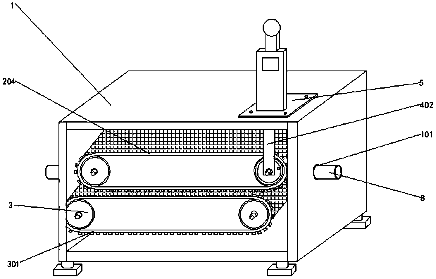 本实用新型属于计长装置技术领域,尤其为一种管材通道计长装置,包括箱体,所述箱体的内部设置有牵引上履带,所述牵引上履带内壁右侧活动连接有第二滚轮,所述第二滚轮的内部贯穿连接有第二轴承,所述第二滚轮的前端面设置有计米轮,所述计米轮的前端面设置有有支撑杆,所述支撑杆的前端面固定连接有第二卡片,所述牵引上履带的内壁左侧活动连接有第一转动主体,所述第一转动主体包括第一滚轮,所述所述第一滚轮的内部贯穿连接有第一轴承,所述第一轴承依次贯穿第一滚轮和第一卡片并延伸至第一卡片的前端面,通过对管材通道计长,防止切割管材通道时造成同一批次切割的管材长度不一样,从而避免了对管材通道的浪费。