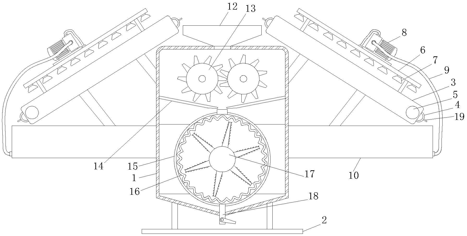本实用新型公开了一种用于废弃塑料管材的破碎回收装置,包括一机体,所述机体的底部固设有底座,所述机体的左右两侧均固设有上料架,所述上料架的中部传动连接有输送带,所述上料架的一侧壁固设有一电机,所述电机的输出端与输送带的一侧同轴固定。本实用新型涉及废旧塑料管材回收技术领域,该用于废弃塑料管材的破碎回收装置,通过设置带有清洗功能的上料机构,能够在废弃管材破碎前将管材上的脏污杂质一并清除,从而使管材自身变得干净卫生,然后再对管材进行破碎,破碎后再对其烘干,从而使管材保持干燥,从而提高了破碎料的品质,有利于后续深加工。
