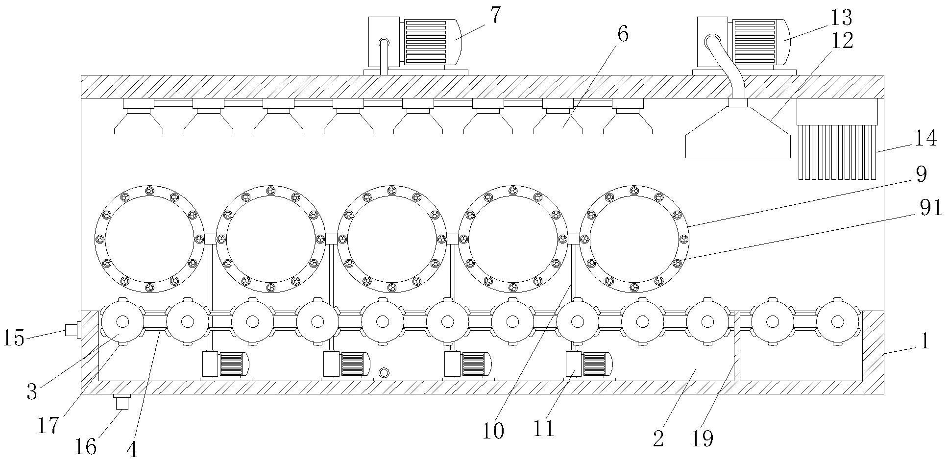 本实用新型公开了一种塑料管材冷却装置,包括一左右贯通的冷却箱,所述冷却箱的底部设置有冷却池,所述冷却池的侧壁安装有多个可转动的输送辊,多个所述输送辊之间通过链带传动连接,所述输送辊的顶部均裸露至冷却池的顶部外,所述冷却箱的一侧壁固设有电机。本实用新型涉及管材冷却技术领域,该塑料管材冷却装置,通过设置内外同步喷淋机构,从而可实现对管材内外壁同步喷淋降温的目的,代替了传统仅通过喷淋管材外壁实现降温的,有效解决了管材内外壁冷却不均的现象,同时该喷淋机构采用循环水模式,提高了资源的利用率,更进一步的,在降温后,通过除水机构可对管材表壁进行除水,方便转移。