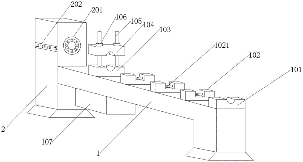 本实用新型公开的属于塑料管材扩口技术领域,尤其是一种塑料管材扩口装置,包括支架和支撑台,扩胀管道的内侧壁固定连接有两个上下对称分布的勒板和两个上下对称分布制风管,制风管位于勒板的右侧,支撑台的左侧设置有扩胀体,扩胀体的右侧固定连接有扩胀头,扩胀头的外侧壁设置有快速加热元件,扩胀体的左侧固定连接有伸缩顶杆,伸缩顶杆远离扩胀体的一端与液压缸的输出端固定连接,通过在扩胀管道的内侧壁固定连接勒板和制风管,热元件将管材加热制软,使扩胀体将管材的管口迅速扩胀,勒板将扩胀的管材直接进行压制,使扩胀的管材的管壁厚度一致,制风管使压制好的管材快速冷却,提高管材的耐硬度,从而使扩口的管材质量提高。