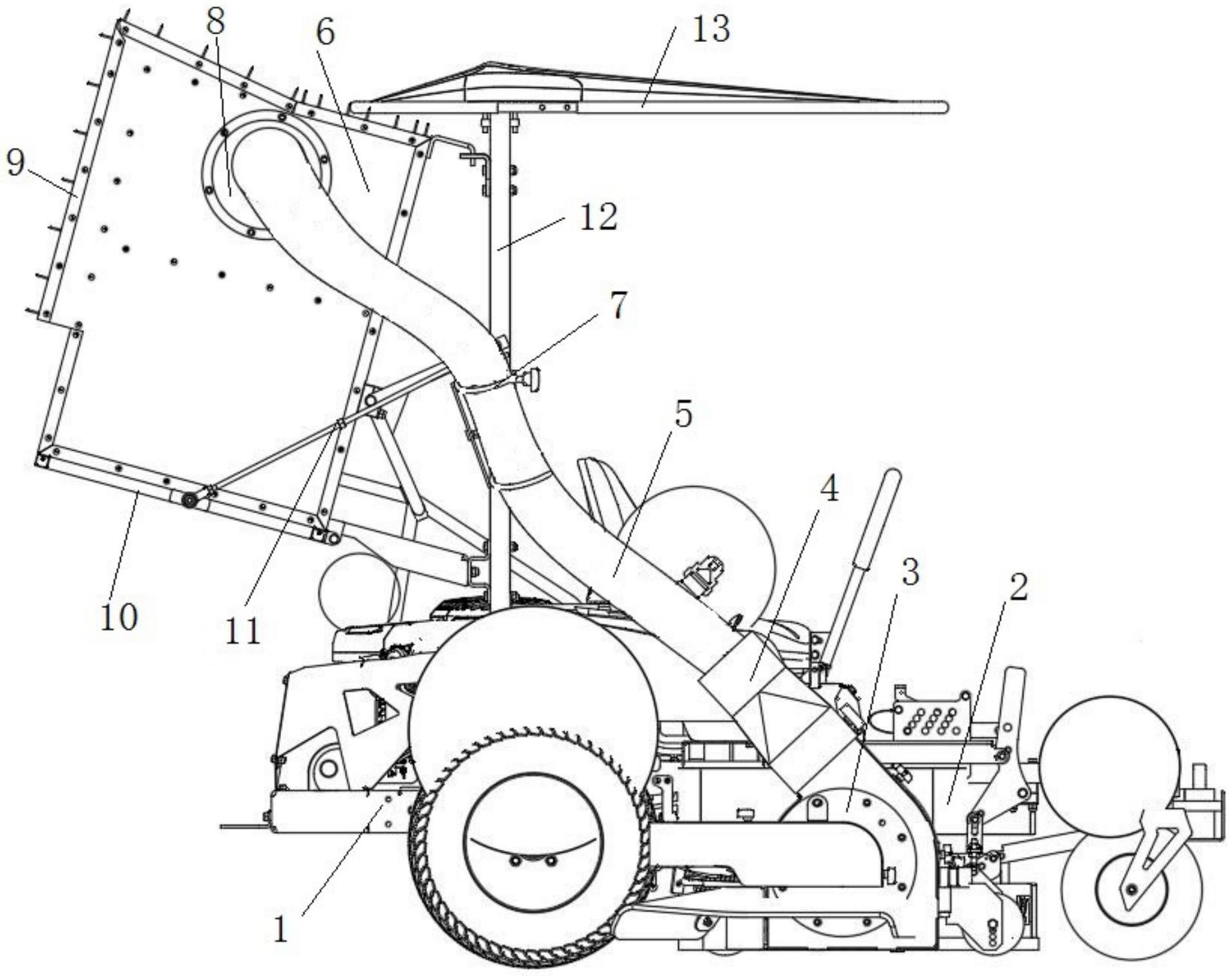 本实用新型公开了骑乘割草机背负式收草装置,包括机体以及安装在机体上的燃油机,所述机体的顶部通过两个撑杆安装有顶棚,所述燃油机的内部转动安装有主轴,且主轴的底端贯穿至燃油机的底部,并安装有刀盘,所述机体的顶端安装有集草箱,所述燃油机的一侧安装有鼓风机,所述鼓风机与主轴之间设有传动结构;本实用新型通过设计的背负式收草装置,可直接安装在骑乘割草机上,在骑乘割草机进行割草的同时,对草屑和割断后的草进行收集,后期只需在割草完毕后将卸料底板旋转打开进行废草的倾倒即可,省去割草后对废草清理的步骤,大幅度提高工作效率,同时本装置通过骑乘割草机上原有的燃油机进行动力提供,无需额外动力源。