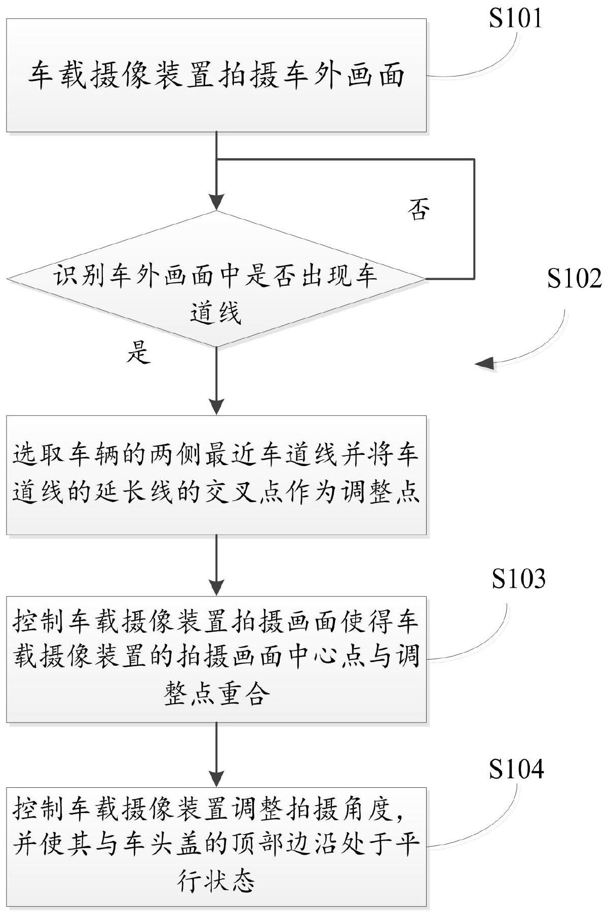 本申请提供一种车载摄像装置的拍摄角度调整方法、拍摄角度调整设备以及车载摄像装置,包括:车载摄像装置拍摄车外画面;识别车外画面中是否出现车道,如果识别到车外画面中出现车道线,则选取车辆的两侧最近车道线,并将车道线的延长线的交叉点作为调整点;控制车载摄像装置调整拍摄画面,使得车载摄像装置的拍摄画面中心点与调整点重合;控制车载摄像装置调整拍摄角度,并使其与车头盖的顶部边沿处于平行状态。本申请能够解决在行驶过程中手动调整摄像头带来安全隐患以及及用户体验差的问题,消除在驾驶过程中因调整摄像头拍摄角度而带来风险,且能更精准的调整拍摄画面。