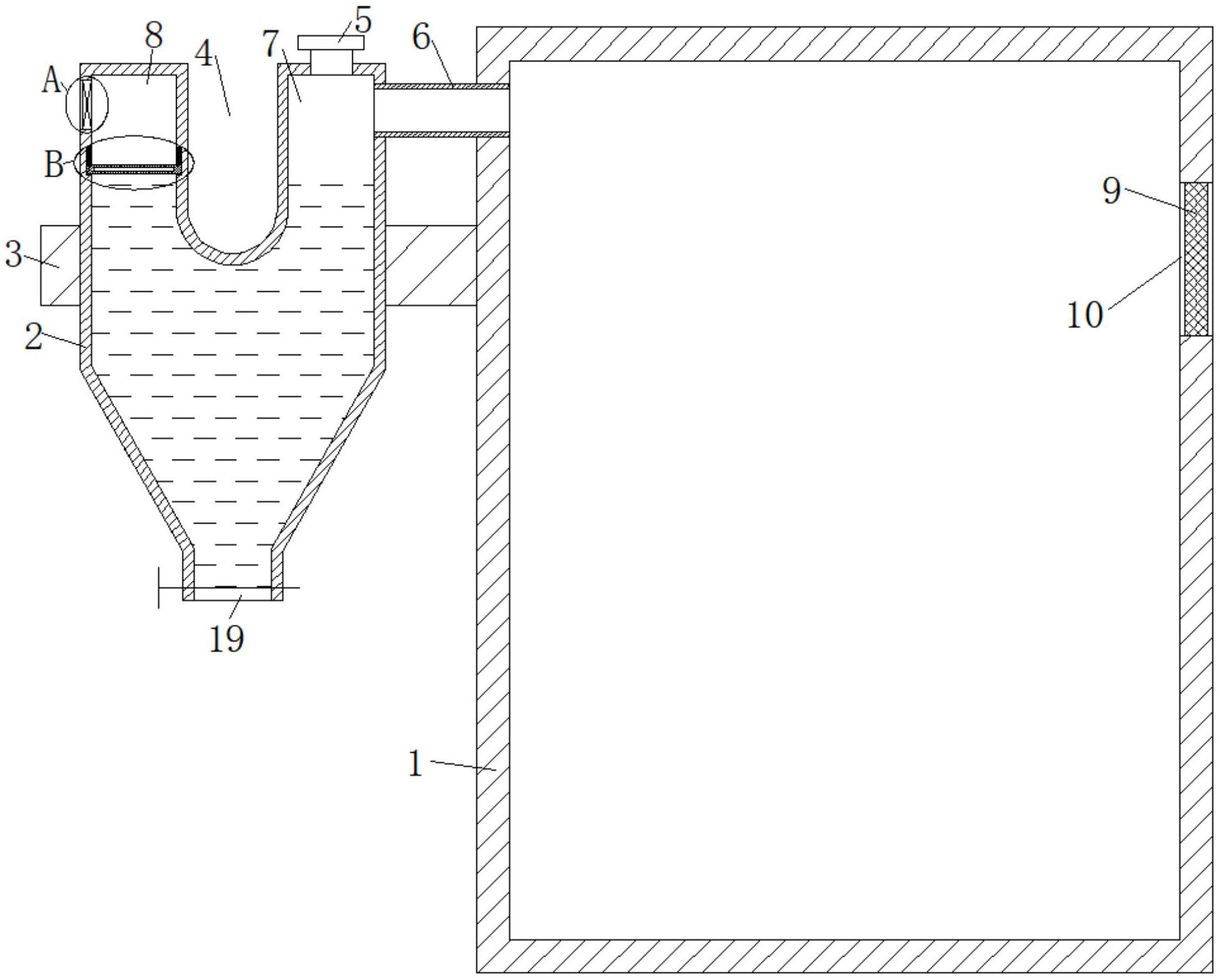 本实用新型公开了一种新型用于活性炭设备的防尘装置,包括设备箱,所述设备箱的一侧设有水箱,所述水箱的顶部设有U型槽,所述U型槽将水箱内部空腔靠近顶端处分为第一空腔和第二空腔,所述第二空腔的内侧壁上对称设有滑槽,所述滑槽的内部滑动连接有挡板,所述挡板的中部设有第三空腔,所述挡板的顶部设有第一通孔,所述挡板的底部设有第二通孔,所述水箱的一侧设有安装孔,所述安装孔内固定设有负压风机。本实用新型中,启动负压风机,设备箱内的空气进入水箱中,空气中的碳粉在水箱底部沉淀,经过滤后的空气从负压风机的出风口排出,可对碳粉进行回收利用,且避免碳粉、粉尘等堆积在设备箱内设备上从而影响设备的使用寿命。