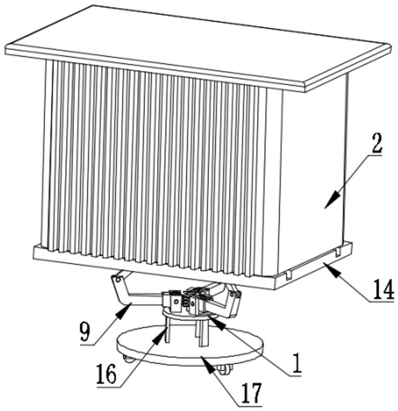 本实用新型公开了一种非晶合金油浸式变压器,包括隔板和变压器本体,所述隔板的中部开设有转动孔,所述转动孔的内部活动安装有转动杆,所述转动杆的上部侧面开设有齿环,所述齿环的侧面啮合连接有齿轮,所述齿轮中部活动安装有连接杆,所述连接杆的两端活动连接有限制块。该种非晶合金油浸式变压器,可以带动齿环和齿轮进行转动,齿轮转动时,可以带动活动块的一端在限制块内侧活动,活动块的上部通过第一活动杆带动被动杆向上移动,因被动杆的上部安装有顶块和垫板,从而可以使垫板和顶块向上移动,同理,反向转动电动机,可以使垫板向下移动,垫板移动到合适位置,推动变压器本体至垫板上,最后达到了便于运输,使用方便的目的。