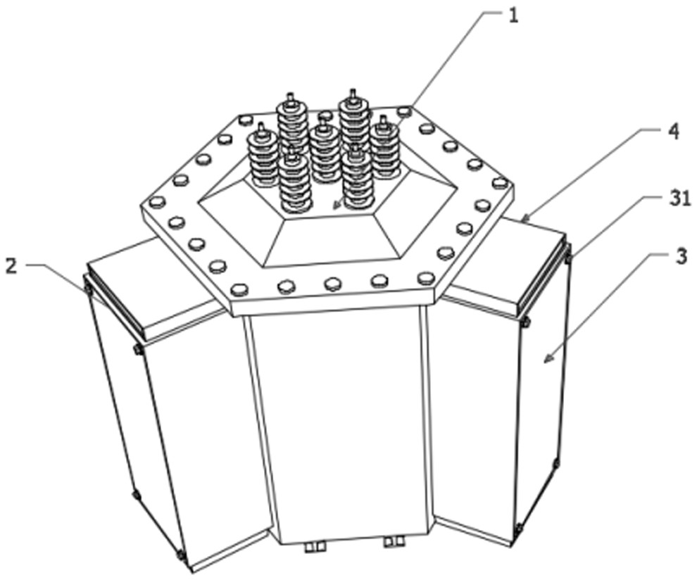 本实用新型公开了一种立体卷铁芯配电变压器,包括变压器主体,变压器主体的外表面固定安装有三个散热箱,三个散热箱内均垂直固定安装有若干散热板,三个散热箱的开口处均可拆卸的安装有挡板,三个散热箱的顶端均可拆卸安装有散热通道,三个散热箱的底端均可拆卸安装有风机,三个散热箱均与对应的散热通道和风机输出端连通设置,本立体卷铁芯配电变压器在散热箱内设置有散热板,并且在散热箱的箱口可拆卸安装有挡板,初步的使得散热箱内部封闭,在散热箱的顶端安装散热通道,通过风机想散热箱内鼓风,增加立体流通性,最终高温气体从散热通道排出,使得整个散热通路具有导向性能,能够进一步的提高散热效率。