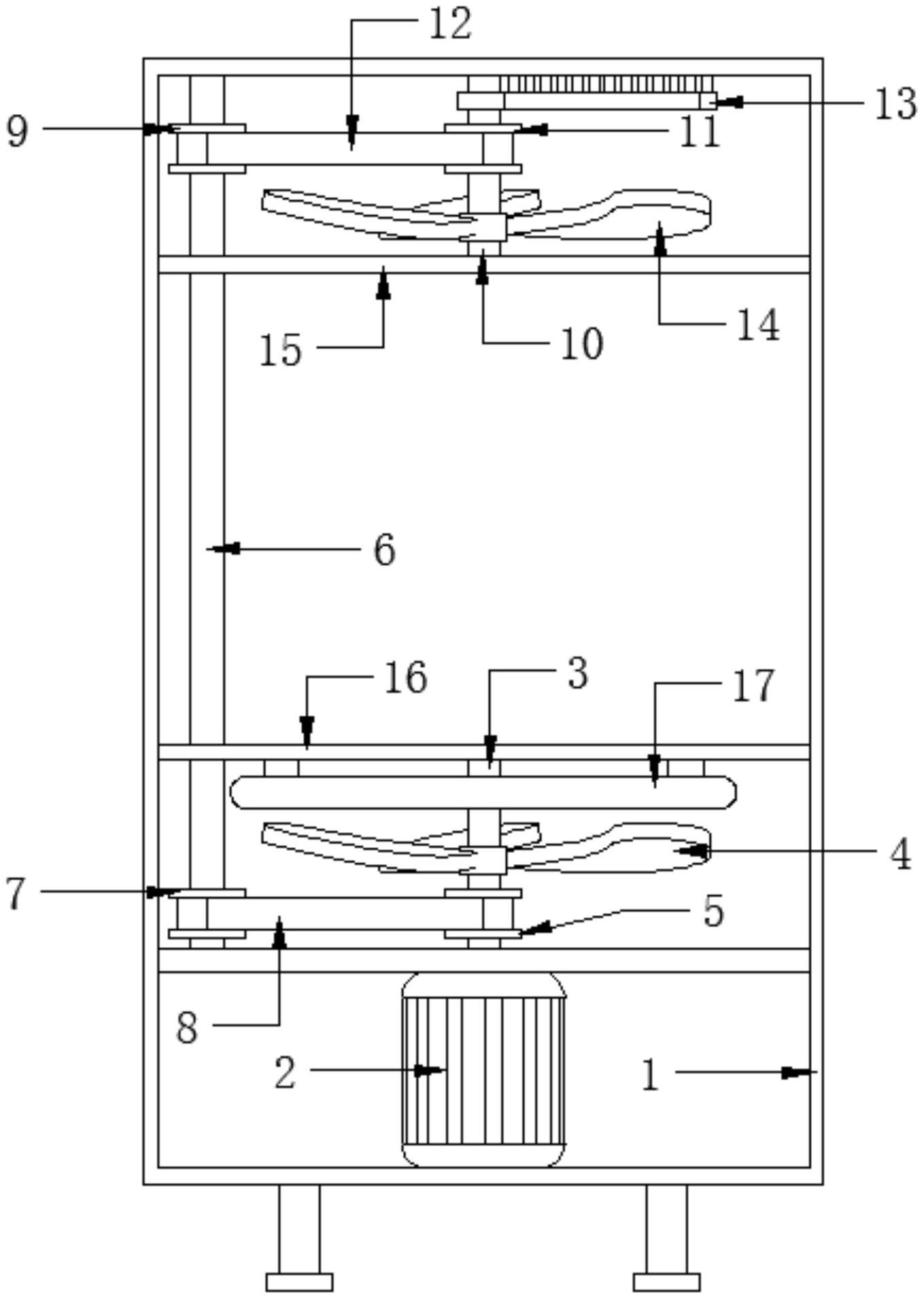 本实用新型公开了一种针对甲醛清除剂喷涂使用的速干装置,涉及速干设备应用技术领域,针对甲醛清除剂的生产过程中需要进行烘干处理,现有的晾干方式速度慢,导致甲醛清除剂生产效率下的问题,现提出如下方案,包括机体,所述机体的内部固定连接有电机,所述电机的输出轴固定连接有驱动杆,所述驱动杆的上方固定套设有第一皮带轮和第一扇叶;所述机体的内部后方转动连接有从动杆,所述从动杆的下方固定套设有第二皮带轮。本实用新型不仅可以通过驱动杆带动第一扇叶转动进行热风烘干处理,同时可以通过连接杆转动带动第二扇叶转动进行内部排气散热处理,有效的提高了对甲醛清除剂喷涂速干的效果和效率。