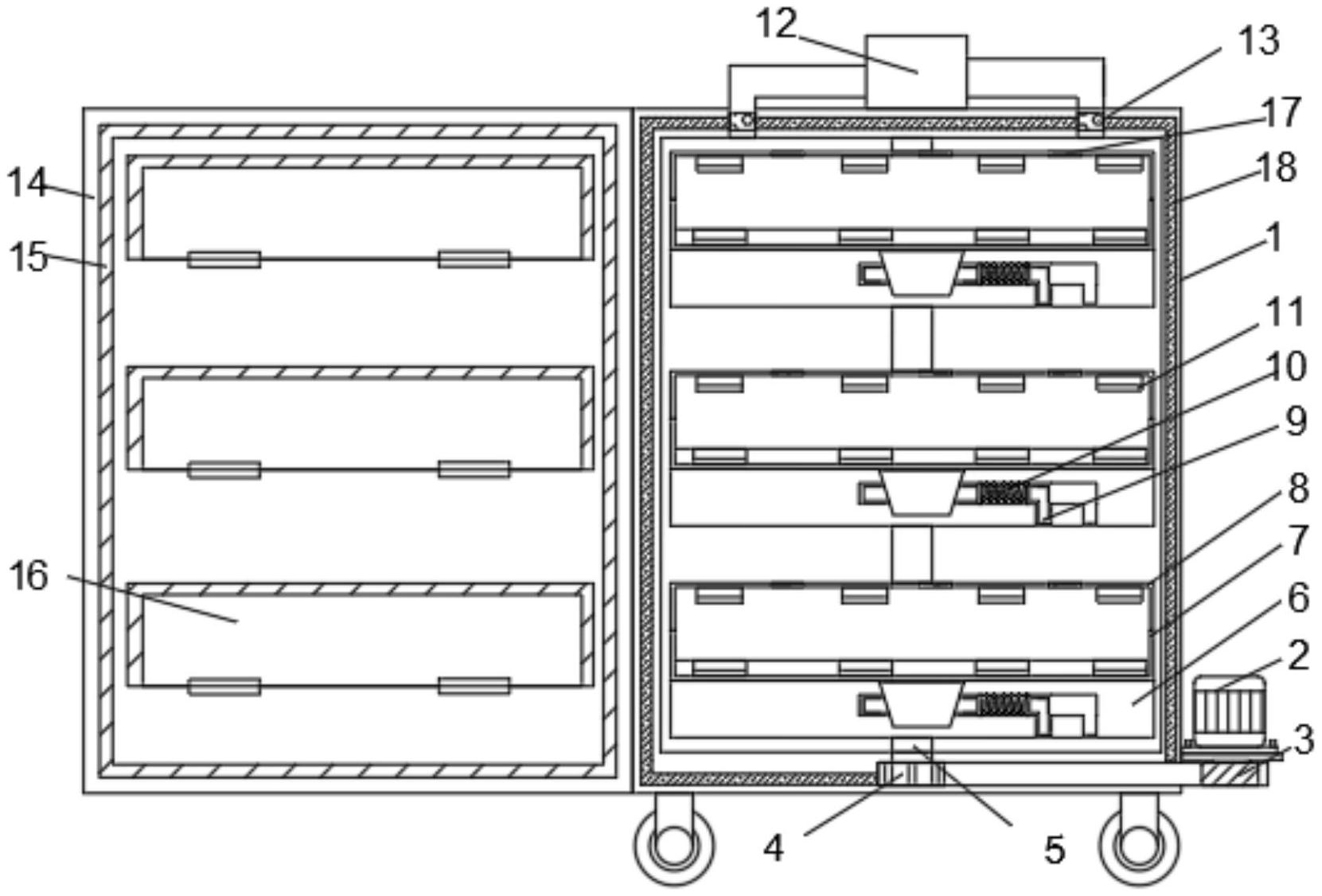 本实用新型公开了一种用于空气净化凝胶的长期密封保质装置,涉及密封保质装置技术领域。包括箱体,箱体的右侧外表面靠近底部处通过螺栓固定连接有旋转电机,且旋转电机的输出端转动连接有旋转齿轮,箱体的上下内壁转动连接有涡杆,且涡杆的底端固定连接有带动齿轮,该用于空气净化凝胶的长期密封保质装置,通过旋转电机转动使用抽拉盒转定更换位置,从抽拉门中可以取出适量的空气净化凝胶,避免全部打开箱门,造成其他空气净化凝胶污染,造成浪费,提高了密封保质装置的节约性,通过冷风机,密封圈和过滤网,可以实现使箱体内温度降低的功能,符合空气净化凝胶的保存环境,增加空气凝胶的保存时间。