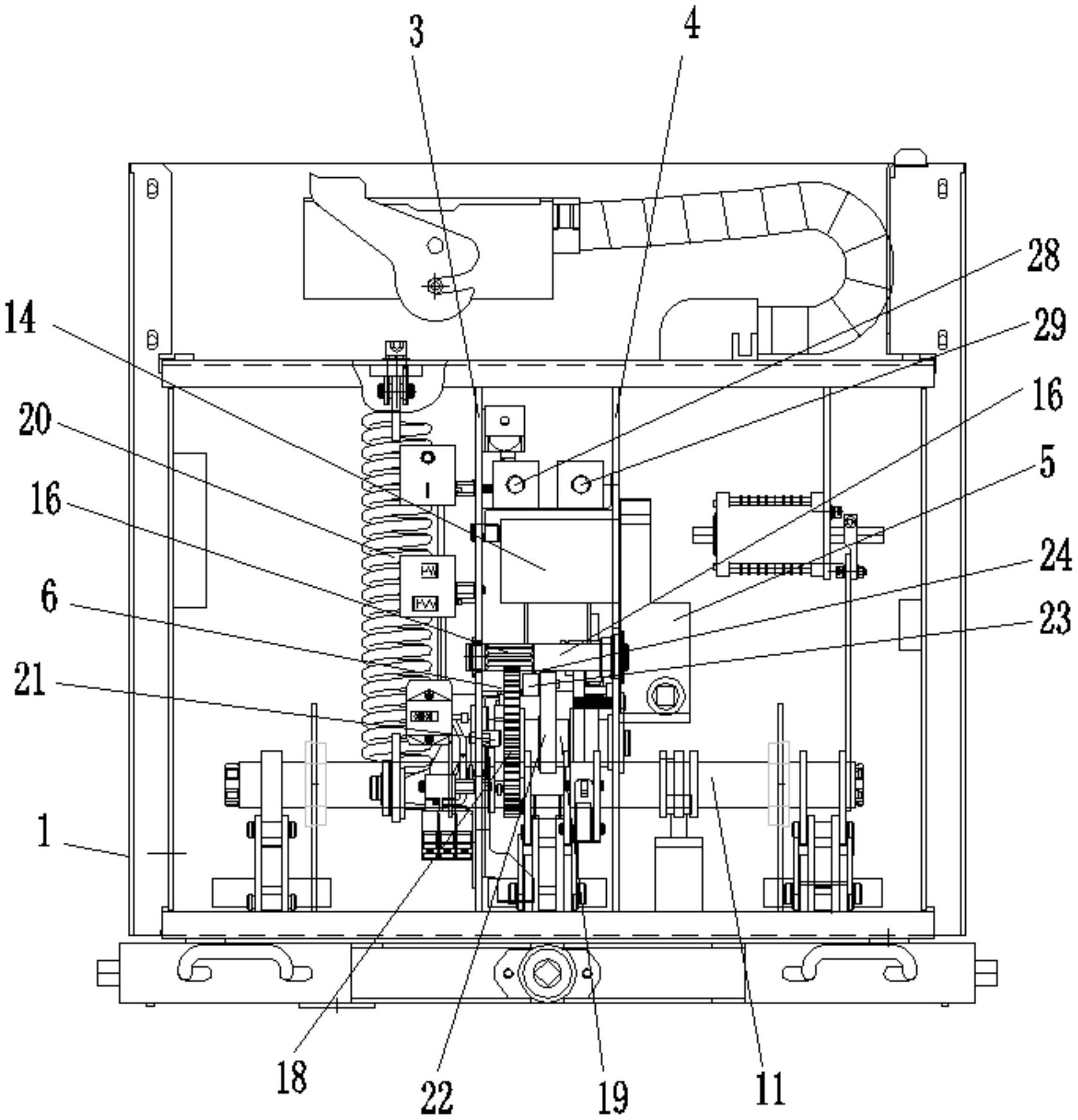 提供一种具有新型操动机构的小型化10KV高压真空断路器,将固封极柱固定于L形结构的箱体后侧下顶面上,箱体内部的左隔板和右隔板平行设置并固定于箱体中部,两用型储能装置下方的弹簧操动机构安装于左隔板和右隔板上,两用型储能装置与弹簧操动机构连接,并由两用型储能装置通过驱动弹簧操动机构驱动传动主拐臂顺时针或逆时针旋转从而使绝缘拉杆与固封极柱中的真空灭弧室实现分闸或合闸的动作。本实用新型通过对高压真空断路器中的储能部分以及传动部分进行重置优化设计,大大简化了10KV高压真空断路器的内部结构,安装配合结构简单易操作,易于维修,减小了零件数量,缩小了10KV高压真空断路器的体积,满足高压真空断路器小型化发展要求。