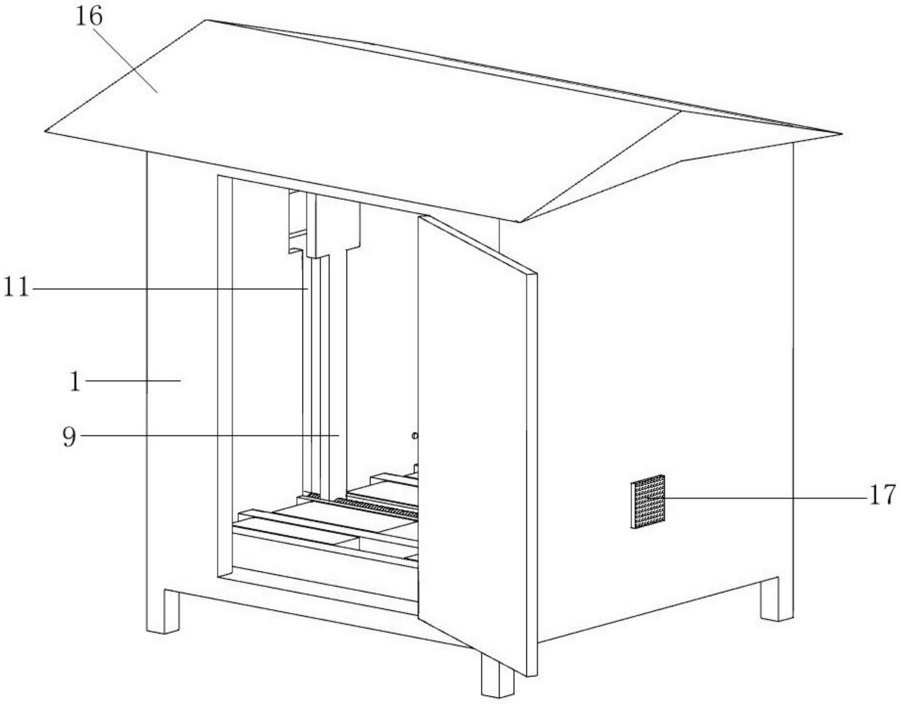 本实用新型公开了一种紧凑型深度融合环网柜,包括环网柜体,环网柜体的底部内壁的中部在左右方向上固定设置有第一支撑柱,第一支撑柱的顶部外壁开设有第一滑槽,第一滑槽中设有双向丝杠,双向丝杠的右端穿过环网柜体连接有一个正反转步进电机;第一支撑柱的前后两侧对称设置有间隔分布的第二支撑柱和第三支撑柱,第一支撑柱与第二支撑柱之间以及第二支撑柱与第三支撑柱之间均设置有移动垫块;双向丝杠的两端分别螺纹连接有第一挡板和第二挡板,环网柜体的右侧内壁开有与第一挡板相配的第一T型槽,环网柜体的左侧内壁开设有与第二挡板相配的第二T型槽,第一T型槽的上部开有排风口,第二T型槽的上部开有进风口,排风口的外壁固定连接有除湿机。