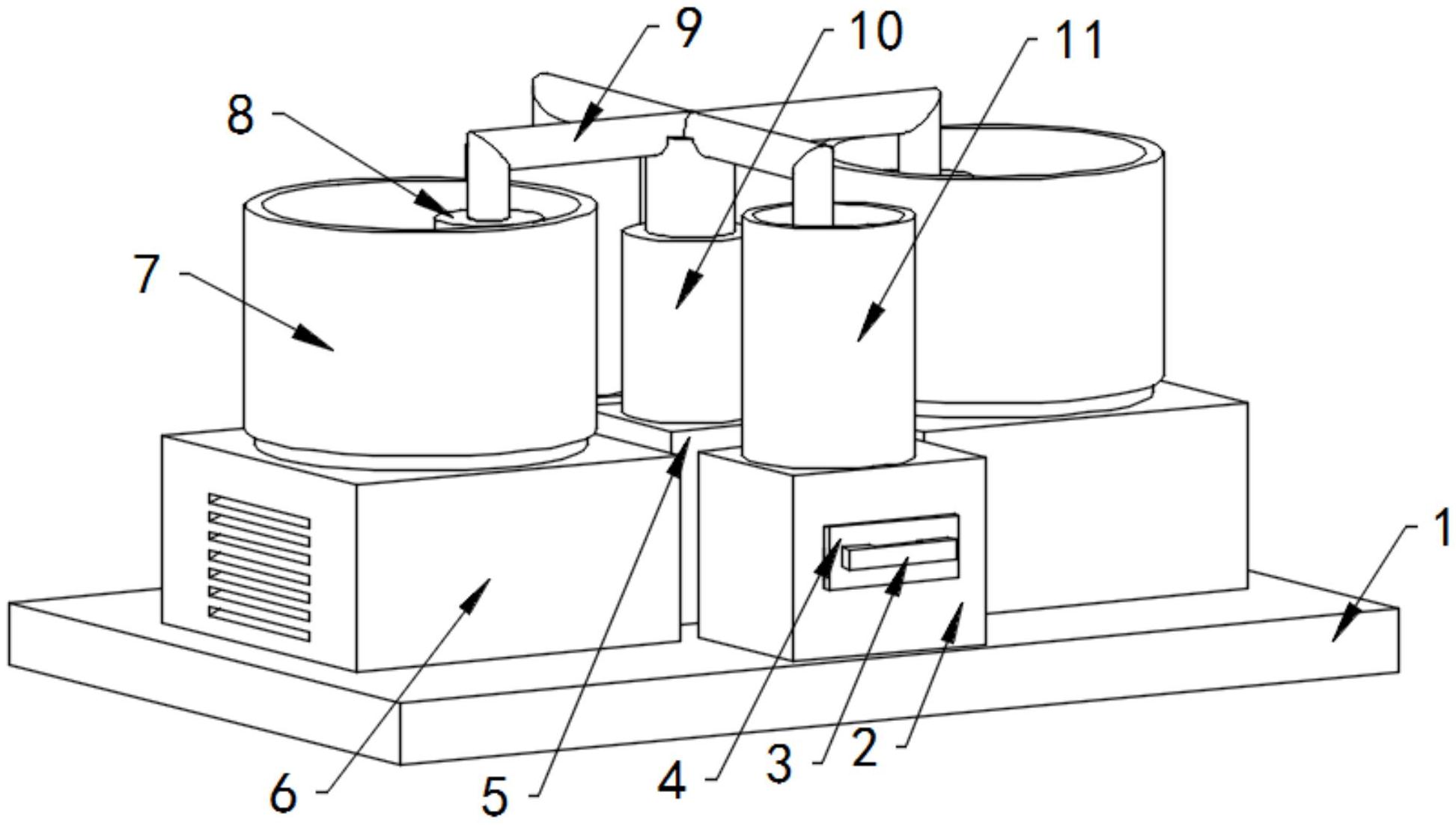 本实用新型涉及工业设备领域,尤其是指一种用于糖生产的活性炭连续脱色装置,包括底板,底板的顶部表面两侧均设置有箱体,所述箱体的顶部转动连接有旋转桶,所述箱体的内部设置有第一驱动电机,所述底板的顶部表面固定有安装座,所述安装座的顶部转动连接有推杆电机,所述推杆电机的输出端设置有旋转杆,所述安装座的内部开设有空腔,且空腔内设置有第二驱动电机。该一种用于糖生产的活性炭连续脱色装置通过设置的旋转桶、活性炭箱、推杆电机、加热桶、和驱动电机等结构,可实现对活性炭的重复利用,在此期间可连续生产,不会间断生产的同时,也对活性炭进行重复利用,提高资源的利用率。