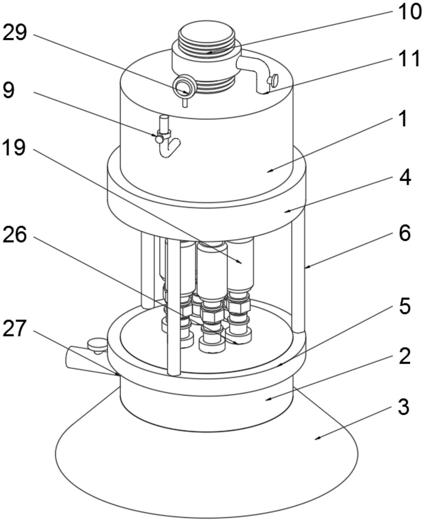 本实用新型公开了以活性炭对淀粉糖液的脱色装置,包括处理罐、储液罐和底座,所述处理罐的顶部开有加压口,与空气压缩机的输出口相连的加压管与加压口连通,所述处理罐的底部一侧开有等距离分布的第一导液口。本实用新型通过处理罐顶部设有的空气压缩机将气体通过加压管排入处理罐内,提高处理罐内的气压值,处理罐内的糖液受到气压的挤压,淀粉糖液通过第一导液口和外螺纹管接头挤入炭柱固定管的内部,通过炭柱固定管内的炭柱主体以便于给予淀粉糖液进行脱色,通过气压挤入的淀粉糖液以便于提高脱色效率,脱色效果好。
