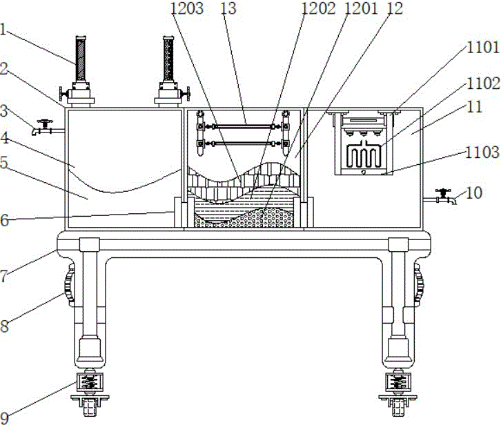 本实用新型公开了一种实验室综合废水处理的活性炭装置,包括中和结构、壳体、工作台和吸附结构,所述壳体顶端的一侧安装有中和结构,所述壳体的一侧连接有进料口,所述壳体的一侧安装有生态滤池,且生态滤池的底端设置有液体废水,所述液体废水的另一侧连接有第一连接管,所述壳体的内部中间位置处设置有吸附结构,且吸附结构的顶端设置有紫外消毒结构,所述吸附结构的另一侧设置有蒸发结构,所述壳体的另一侧连接有出料口,所述壳体的底端安装有工作台,且工作台的两侧安装有把手,所述工作台底端的两侧均安装有移动结构。本实用新型通过蒸发结构达到高温蒸发灭菌的效果,最后通过出料口流出处理过的液体废水。