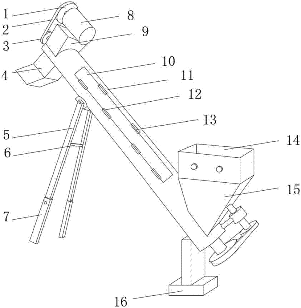 本实用新型公开了一种用于回转炉的进料装置,包括绞龙筒与缓冲机构,所述绞龙筒的下端外表面固定安装有底板,且绞龙筒的上端外表面固定安装有底座,所述底座的上端外表面固定安装有电动机,且电动机的上端外表面活动安装有主动轮,所述主动轮的外表面活动安装有第一皮带,且第一皮带的内表面活动安装有第一从动轮,所述绞龙筒的一侧外表面设置有出料口,所述绞龙筒的另一侧外表面固定安装有粉碎机构。本实用新型所述的一种用于回转炉的进料装置,设有粉碎机构、缓冲机构与伸缩轴,能够粉碎原料,避免电动机直接将震动传给地面,还可以防止进料装置产生位移,并调节进料口的高度,带来更好的使用前景。