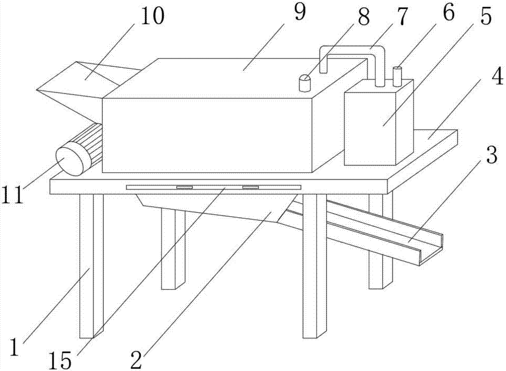 本实用新型公开了一种用于活性炭生产的冷却装置,包括底板,所述底板的上端外表面固定安装有冷却箱与除尘箱,所述冷却箱的上端外表面固定安装有警示灯,且冷却箱的一侧外表面固定安装有进料板与鼓风机,所述除尘箱的上端外表面固定安装有U型管与出风管,所述底板的下端外表面固定安装有立柱与漏斗,所述漏斗的一侧固定安装有滑板,所述冷却箱的内部活动安装有翻动机构,所述漏斗与底板之间活动安装有出料板。本实用新型所述的一种用于活性炭生产的冷却装置,设有翻动机构、除尘箱与警示灯,可以提高冷却效率,能够保护操作人员的工作环境,还在冷却完成后提示操作人员,带来更好的使用前景。