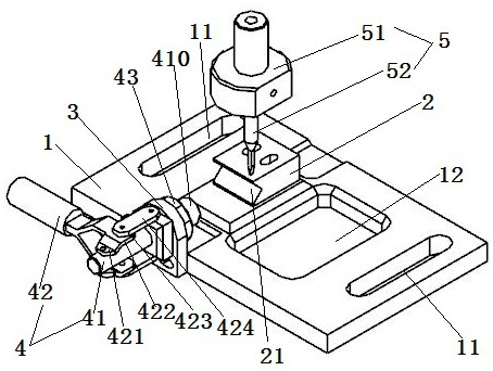 本实用新型公开了一种塑壳断路器机构弹簧装配装置,包括底座,其上安装有弹簧固定件,弹簧固定件上形成有定位部;夹具机构设置在底座上,夹具机构包括伸缩件和伸缩驱动件,伸缩件与弹簧固定件的定位部相对且间隔设置,伸缩件与定位部之间形成有夹持腔,伸缩件具有朝向定位部方向伸出移动以将拉伸弹簧抵接在定位部上并夹紧在夹持腔内的第一状态、和朝向远离定位部方向缩回移动以松开位于夹持腔内的拉伸弹簧的第二状态;冲压组件适于安装在冲床的伸缩杆上且悬于夹持腔的上方,在第一状态时冲压组件下压使得拉伸弹簧的待装配端的第一节与第二节之间打开并保持在非并紧的状态。解决采用手动操作螺丝刀导致效率低、劳动强度大且一致性难以保证的问题。