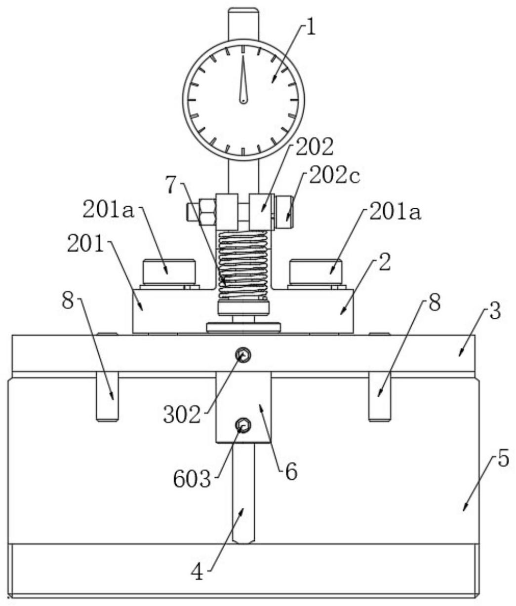 本实用新型属于发动机检具技术领域,涉及一种缸体止推面深度测量检具,包括:测量仪器、安装块、定位块、测杆、校对块,将测量仪器安装到安装块上,再将安装块与定位块连接,以及定位块上滑动设置的测杆,组合形成本申请示出的缸体止推面深度测量检具,通过校对块校准测量仪器的零位,将检具转移至缸体,使定位块与缸体加工基准面重合,测杆的最低端与缸体止推面接触,读取测量仪器的测量值,从而准确测量缸体止推面的加工深度。采用本申请的技术方案提出的缸体止推面深度检具,具有检测操作便捷、高效,能够确保测量精度的同时减轻作业人员的劳动强度,从而提高生产效率,具有经济性好的有益效果。