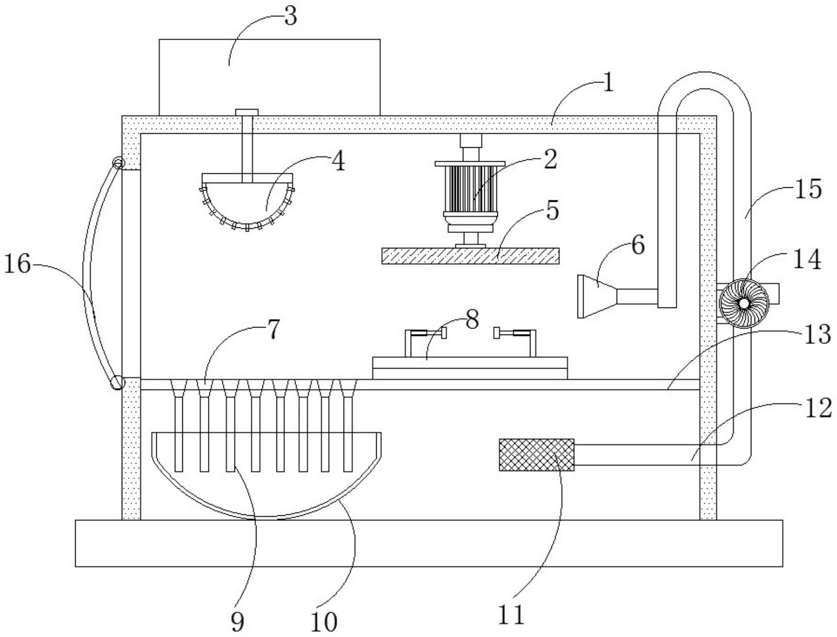 本实用新型公开了一种玻璃容器加工用端口打磨器,包括:机架和安装于机架内腔中的中部隔板;中部隔板的顶端安装有玻璃容器固定架,中部隔板上开设有若干个漏斗状排水口,漏斗状排水口的底端连接有排水竖管;机架的内腔设置有喷气嘴、打磨轮和半球形喷水头,半球形喷水头位于打磨轮的一侧,打磨轮的另一侧设置有喷气嘴,喷气嘴的进气端连接有排风管,排风管贯穿于机架的顶端并延伸至机架外侧,排风管的末端连接到风泵的出气端,风泵的进气端连接有抽气管;通过加快机架内部的气流循环,使得装置内的粉尘在水滴作用下快速沉降,带有粉尘的空气不会流出到装置外部污染工作环境,也避免了机架内部积灰过多。