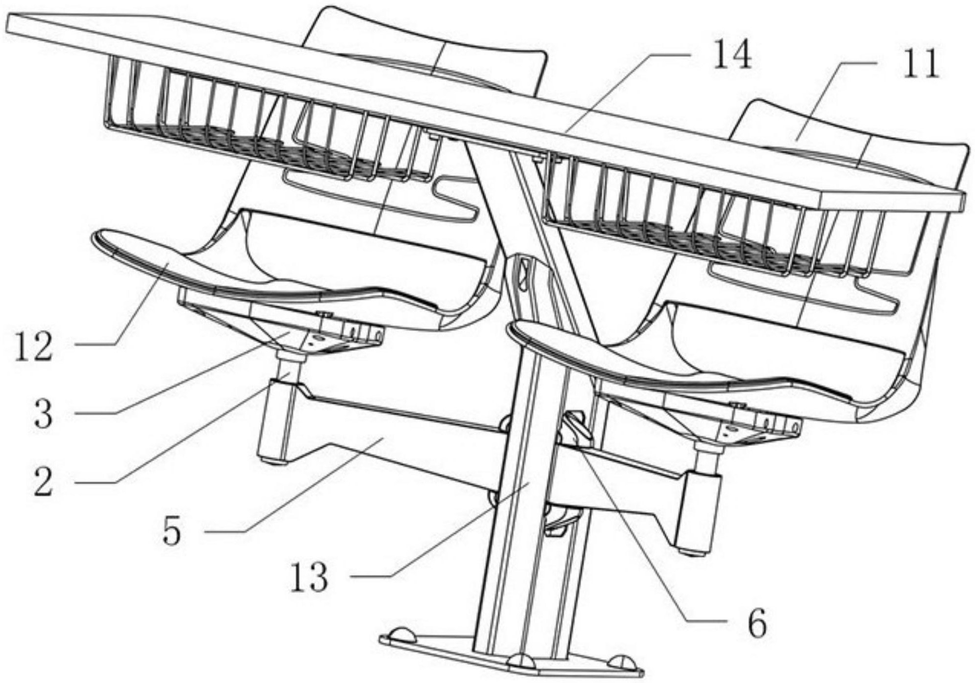 本实用新型提供一种可自动复位的一体式桌椅。其包括座板、设于座板的安装座、支架、设于支架且位于座板前的桌板、自动复位回旋轴、锁紧机构、支撑杆、设于支架的自动回正机构;安装座设有卡槽、与卡槽相通且轴向竖直的轴孔;自动复位回旋轴顶部插入轴孔并与轴孔配合连接;锁紧机构包括连接螺杆、卡接部、连接部;卡接部分别固设于连接部顶端两侧并卡接于卡槽;连接部底端设有斜面,连接部底部插入轴孔,自动复位回旋轴顶部与斜面配合相接;连接螺杆穿设于连接部并与自动复位回旋轴螺纹连接;自动复位回旋轴底部固设于支撑杆一端;支撑杆另一端连接于自动回正机构以使支撑杆转动后自动回正。本实用新型新颖独特,通用性好,自动回正且回正效果佳。