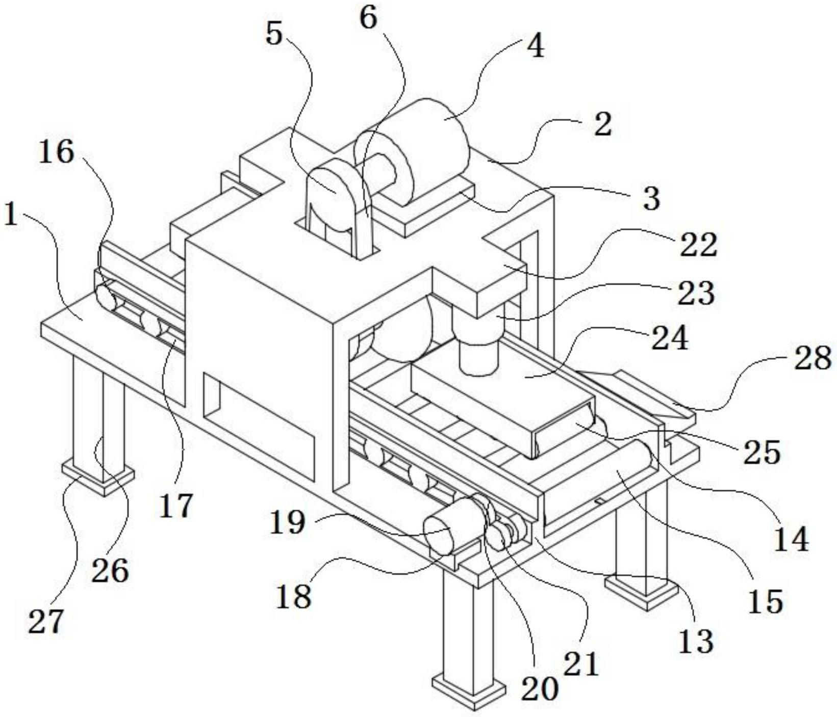 本实用新型公开了一种木板切割装置,涉及木材加工技术领域。本实用新型包括底座,底座上表面安装有安装框架,安装框架上表面安装有第一安装座,第一安装座上表面安装有第一转动电机,第一转动电机输出端安装有第一动力齿轮,第一动力齿轮外表面安装有第一齿轮条。本实用新型通过控制第二转动电机,利用第二动力齿轮与连接齿轮之间的啮合,带动带动齿轮旋转,然后通过带动齿轮外表面安装的第二齿轮条,带动运输辊转动,从而带动木材移动,提高了送料的效率,而且有利于省时省力;然后通过控制第一转动电机,利用第一动力齿轮与第一齿轮条之间的啮合,以及第一齿轮条与传动齿轮之间的啮合,带动切割片对木材进行切割。