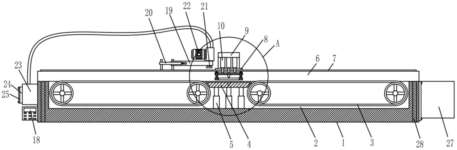 本实用新型涉及一种床上用品面料的裁切装置,包括裁切台,裁切台的上端面开设有安装槽,安装槽内对称转动连接有两组输送带,两组输送带之间设置有垫板,裁切台的上端面前后两端固定有挡板,挡板的上端面设置有电动滑轨,电动滑轨上滑动连接有安装块,安装块上螺栓连接有L型支架,L型支架的一端固定有多个气缸,气缸的底部工作端螺栓连接有安装板,安装板的下端面滑动连接有限位杆,限位杆的底端固定有压环,压环和安装板之间设置有弹簧,安装板下端面可拆卸连接有切割刀。压环、限位杆和弹簧的设计,可避免裁切过程中面料滑动,保证裁切质量;输送带的设计,可降低人工劳动强度,实现自动裁切。