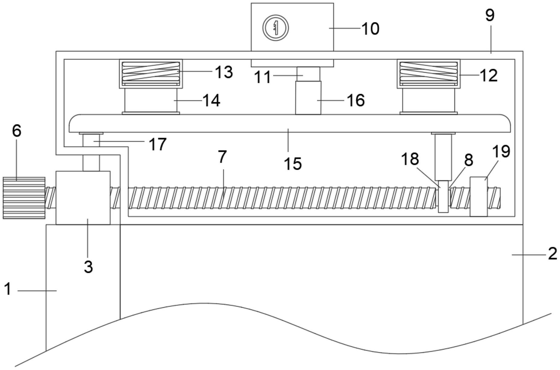 本实用新型公开密封文件柜,包括柜门,所述柜门一侧连接有柜体,所述柜门顶部固定有连接块,旋转旋钮并带动螺纹杆转动,直至螺纹杆远离旋钮的一端分别与连接块上的一号螺槽、T型框架上的二号螺槽以及限位板上的二号螺槽螺纹连接,此时螺纹杆上两个一号插槽的位置分别位于两个下压柱底部Y型压块的正下方,通过钥匙插入卡锁内,并将锁舌从卡锁内弹出,锁舌抵住传动块,从而使下压板下降,下压板下降时,带动内压块下降以及弹簧形变,进而使一侧的Y型压块由T型框架的二号插槽处、连接块的插孔处插入一号螺槽内,并与螺纹杆一端一号插槽外壁卡接,使另一侧的Y型压块由T型框架内靠近限位板一侧的位置插入螺纹杆另一端的一号插槽内,并与其卡接。