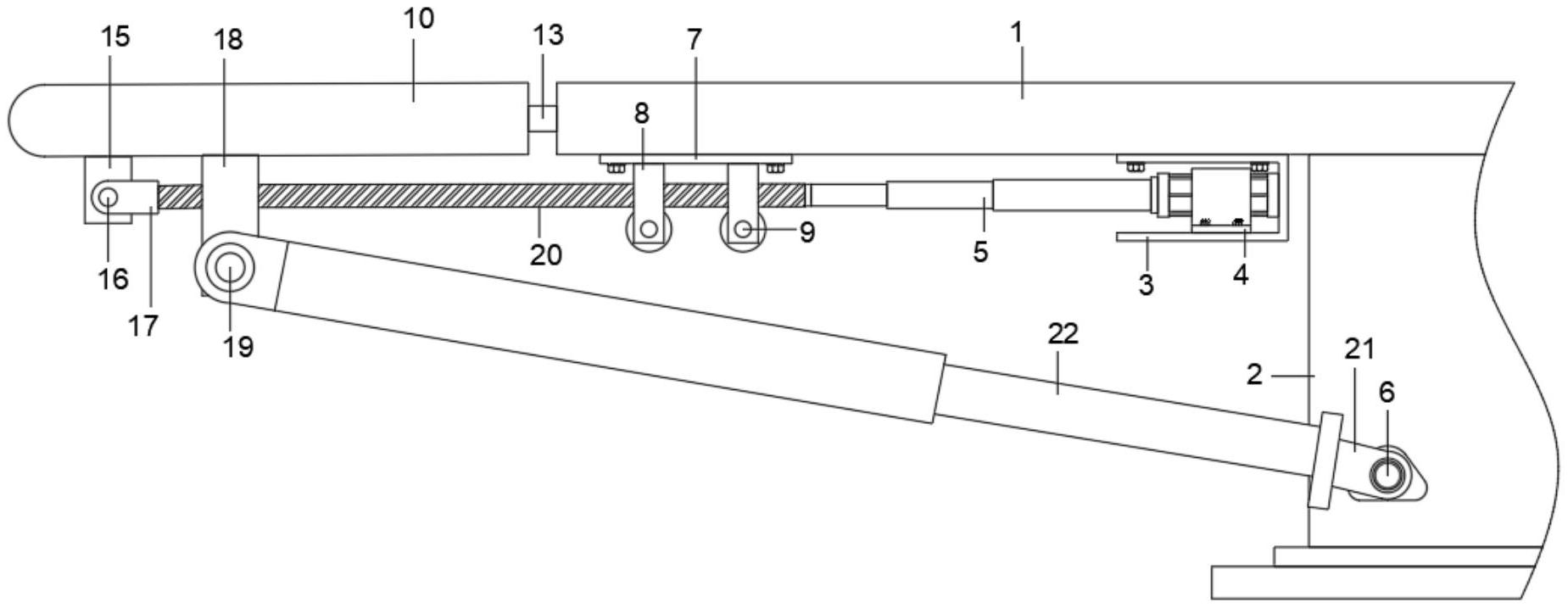 本实用新型公开可升降的办公会议桌,包括支撑座,所述支撑座顶部固定有桌板,所述桌板顶部靠近支撑座的一端设置有固定框架,本实用新型所达到的有益效果是:通过推杆电机的工作,带动双延长杆向T型滑块一侧的方向移动,双延长杆的移动带动T型滑槽内的T型滑块向远离桌板一端的方向移动,双延长杆在移动的时候,且在其移动的过程中,会带动两端的弹簧气杆伸出,弹簧气杆在弧形板撑起时,起到了大部分支撑的作用,双延长杆带动弧形板有竖直状态变成与桌板成平行的状态,起到了限位移动且小部分支撑的作用,此时,停止推杆电机的工作,使弧形板保持当前角度即可,从而可以使议桌可以容纳下更多的人,具有很好的实用性。