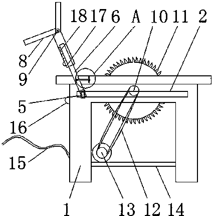 本实用新型公开了一种防溅射木工切割锯,包括机台、横板和弹簧伸缩扣,所述机台表面开设有滑槽,且滑槽内部安置有滑块,所述滑块外表面连接有伸缩杆,且伸缩杆上连接有第一旋转轴,所述第二固定杆上方连接有防护板,且防护板中设置有转轴,所述机台内部设置有第二旋转轴,且第二旋转轴上连接有切割锯,所述第二旋转轴表面安置有皮带,且皮带上连接有电机,所述横板设置在电机下方,且电机上连接有外接电源线,所述第二固定杆上连接有挂钩,且挂钩挂在固定块上。该防溅射木工切割锯在机台上设置了第一固定杆,在第二固定杆两端分别连接了第一固定杆上和防护板,能够在使用时避免切割的木屑溅到工人脸上,能很好的对施工的工人进行防护。