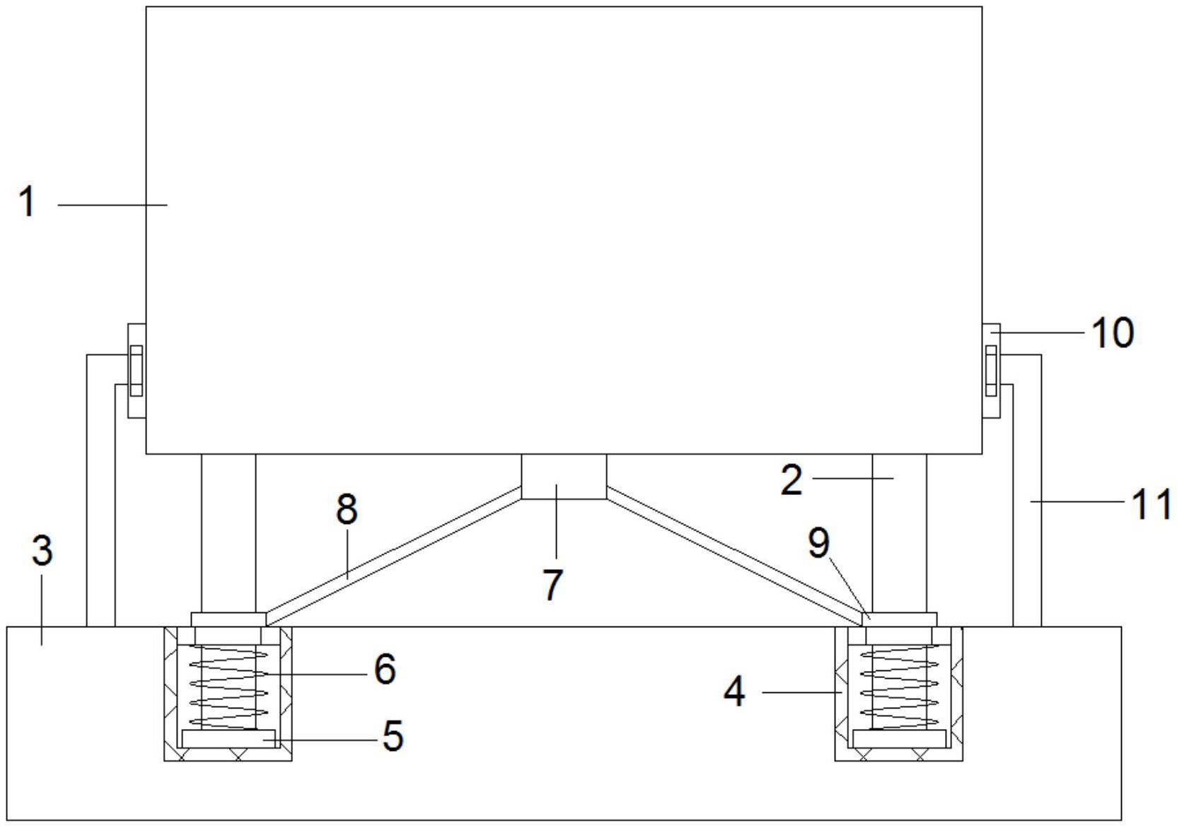 本实用新型公开了发电机技术领域的一种发电机组静音箱的防震装置,包括静音箱,静音箱的底部左右两侧分别平行螺接有两组支撑杆,静音箱的下方设有底座,底座的顶部左右两侧均平行设有两组连接槽,支撑杆的底部延伸至对应连接槽的内腔,且支撑杆的外壁与连接槽的内腔顶部中央滑动插接,支撑杆的底部螺接有挡块;本实用新型通过在支撑杆与底座的连接槽之间设有弹簧,在震动的时候,由于弹簧的顶部和底部分别与连接槽的内壁和挡块的顶部相连,使得震动时通过弹簧的弹性势能有效缓冲支撑杆的震动,同时底座通过直角滑块的两端长短不一的直角边连接静音箱外壁的滑槽,避免静音箱整体发生较大震动,有效防震。