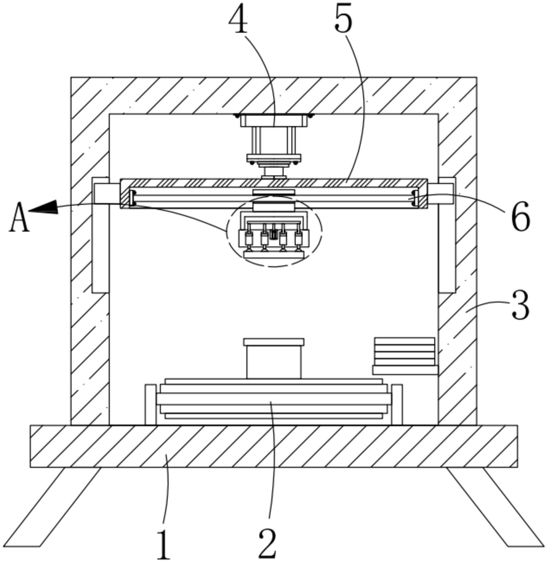 本实用新型提供一种涂料生产用封罐装置。涂料生产用封罐装置,包括:底板;输送机构,所述输送机构固定安装在所述底板的顶部;第一支架,所述第一支架固定安装在所述底板的顶部;第一液压缸,所述第一液压缸固定安装在所述第一支架的顶部内壁上;框板,所述框板滑动安装在所述第一支架的两侧内壁上;电动导轨,所述电动导轨固定安装在所述框板的两侧内壁上;U型架,所述U型架固定安装在所述电动导轨的移动座上;长形块,所述长形块固定安装在所述U型架的底部;多个腔体,多个所述腔体均开设在所述长形块上。本实用新型提供的涂料生产用封罐装置具有操作简单,省时省力,提高封罐效率和效果的优点。