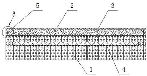 本实用新型公开一种防滑人造石英石板,包括基体层和防滑层,该防滑层为PVC磨砂膜。基体层上表面附着的防滑层采用PVC磨砂膜使其上表面变得不光滑、具有磨砂质感,产生防滑效果;防滑层完全覆盖住基体层上表面且其侧边延伸至基体层的侧面,减少防滑层从侧边与基体层分离的几率;PVC发泡缓冲层及玻璃纤维网格布可防止基体层尺寸收缩变形,增加其稳定性;在生产时即在基体层上增设防滑层,减少使用时涂抹防滑剂等防滑操作,使用方便;PVC发泡缓冲层侧边所设凹槽可增加防滑层与基体层的粘附连接作用。