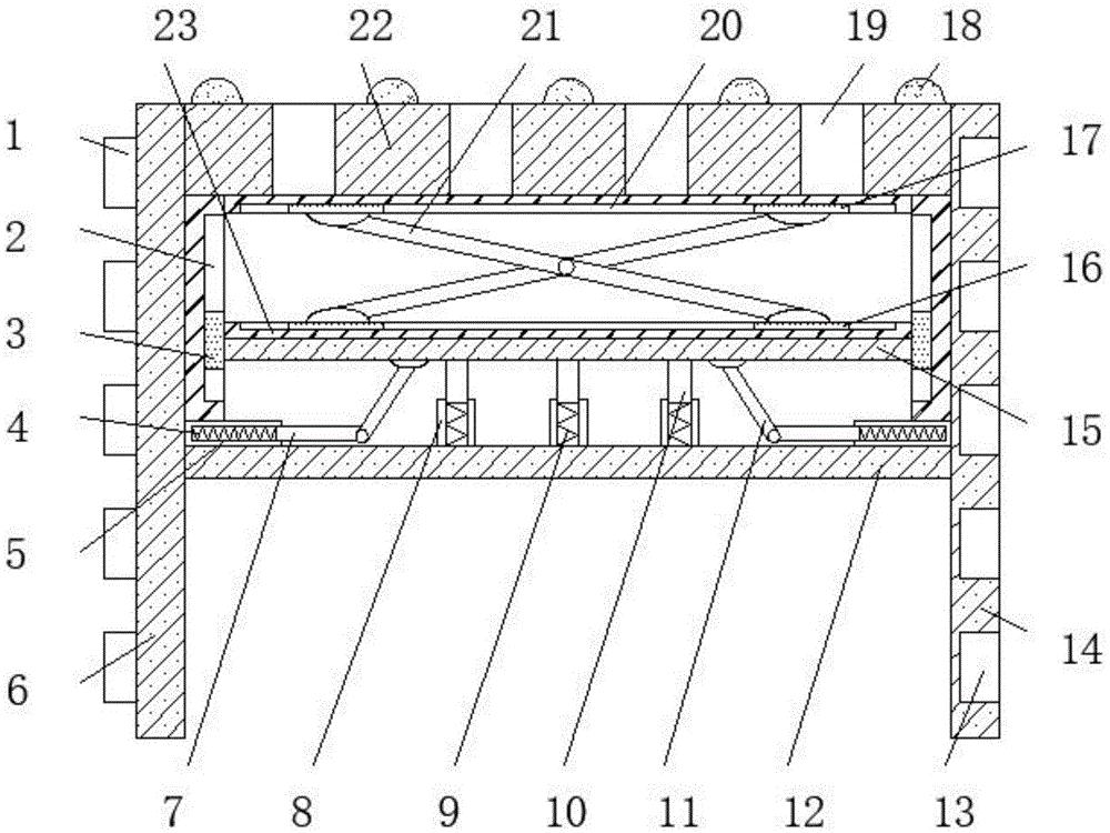 本实用新型公开了一种稳固性好的冲压盖板,包括第一承台板和冲压盖板本体,所述第一承台板一侧的侧壁竖直安装有第一侧向板,所述第一侧向板顶端靠近第一承台板的一侧水平安装有冲压盖板本体,所述冲压盖板本体底端的两侧均水平安装有第二滑轨,所述冲压盖板本体的顶端均匀安装有凸起块,所述第二侧向板内部远离冲压盖板本体一侧均匀设置有与卡块相匹配的卡槽,所述第一承台板顶端的中间位置处均匀竖直安装有第二套筒,所述第二弹簧顶端竖直安装有贯穿第二套筒顶端的第二连接杆,所述第二套筒两侧的第一承台板顶端均水平安装有第一弹簧。该稳固性好的冲压盖板,当冲压盖板受到压力时冲压盖板本体内部产生弹性形变从而增加冲压盖板抗压性能。