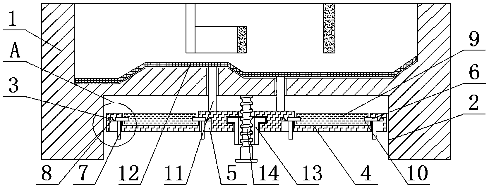 本实用新型公开了一种通信压铸腔体,包括模具本体,模具本体底端的中部开设有第一矩形槽,第一矩形槽的内部活动套接有活动架,活动架顶端的两侧分别开设有第二矩形槽,第二矩形槽内部的两侧分别开设有滑槽,滑槽的内部活动套接有活动杆,活动杆底端的一侧固定连接有圆杆,活动杆的一端固定连接有复位弹簧,复位弹簧的端部与滑槽内部的一侧固定连接。该种通信压铸腔体,通过螺纹杆、转筒、连接杆和活动架的配合使用,使转筒转动时可以带动活动架上升,进而通过连接杆带动活动板上升,使活动板推动模具本体内腔的成型壳体上升,使成型壳体不会继续粘附在模具本体的内腔,便于成型壳体的取出。